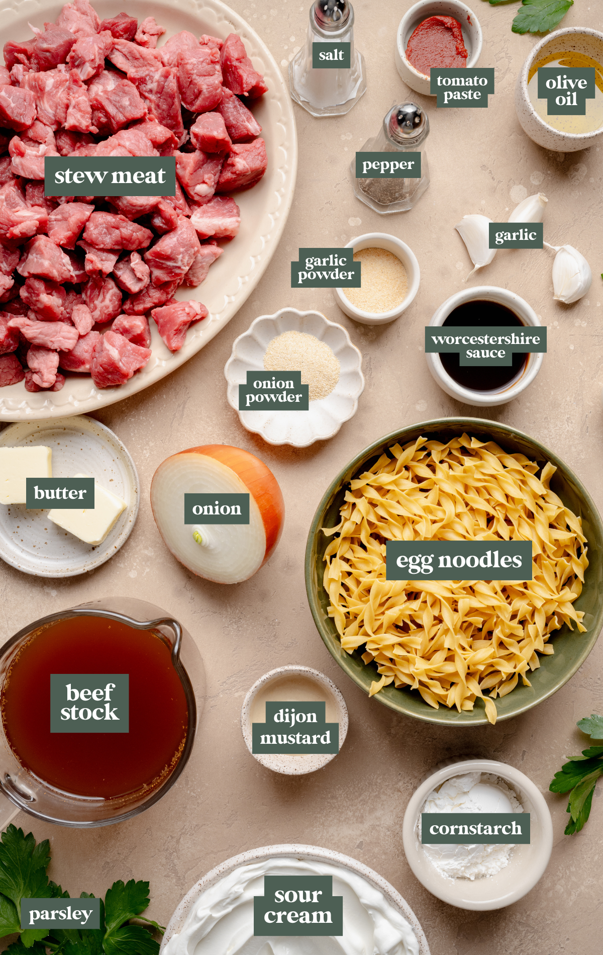 - Stew meat (or chuck roast): Pre-cut stew meat works great for convenience, or you can use a boneless chuck roast cut into bite-size cubes. If you prefer a more traditional stroganoff texture, thinly slice the chuck roast against the grain and slice into strips instead of cubes.
