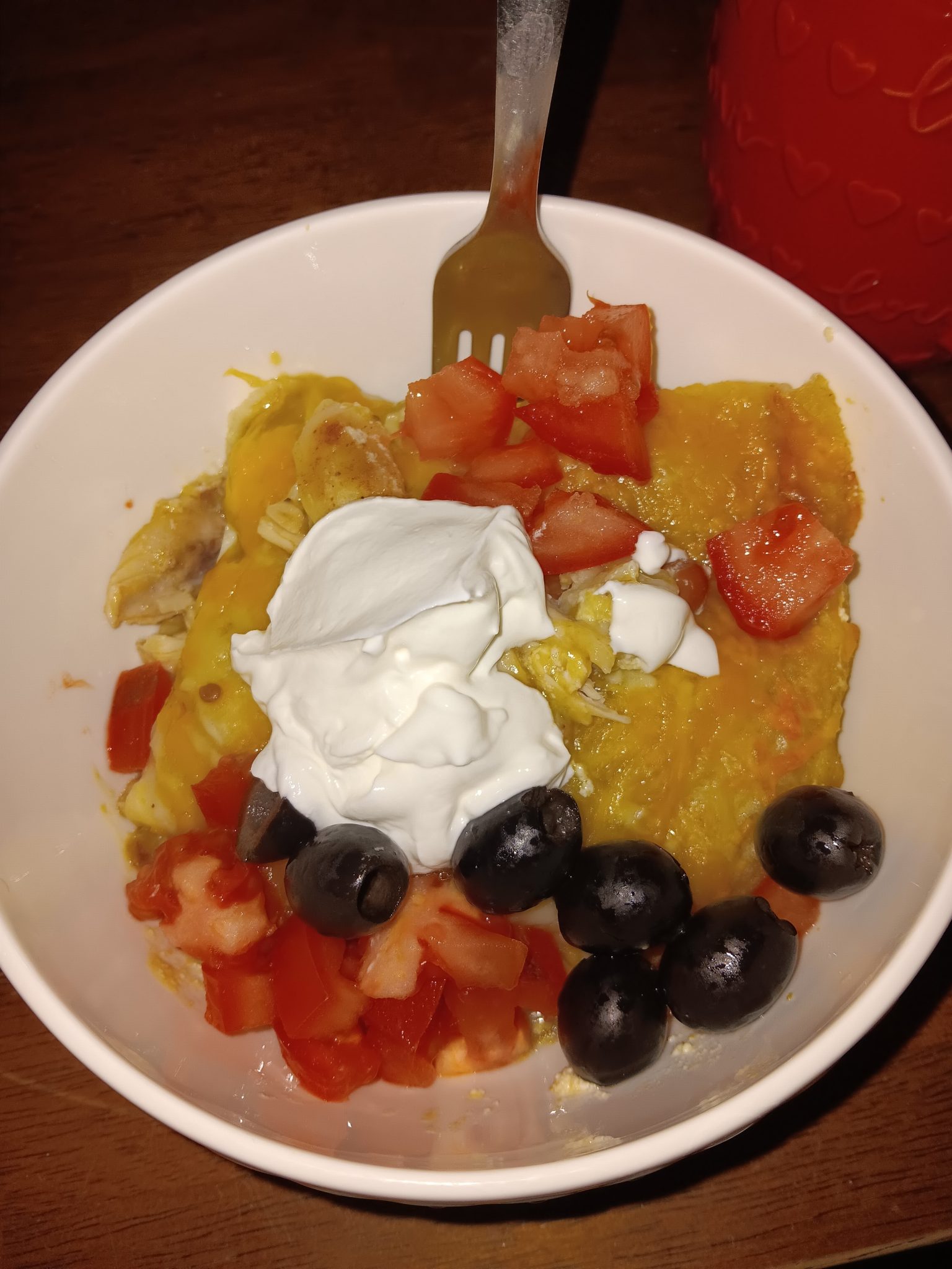 So yummy..I didnt have green chilies so I diced up jalapeños and green garlic stuffed olives….topped with tomatoes and sour cream and black olives !!