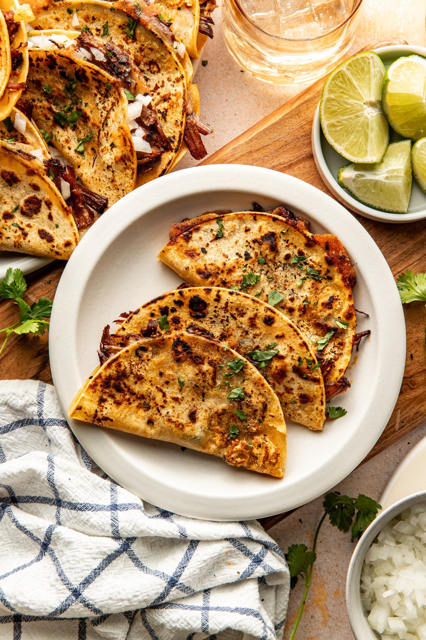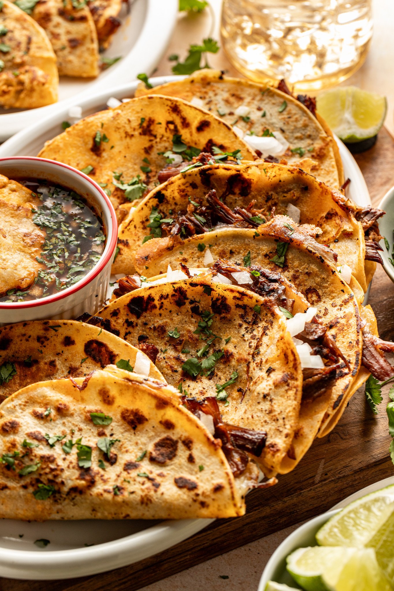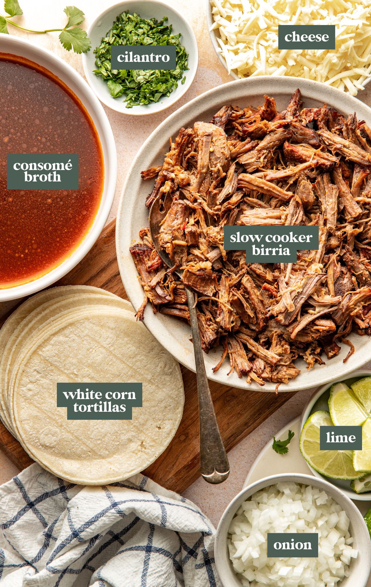 - Slow cooker birria: These tacos use my Easy Slow Cooker Birria. You can also enjoy this birria in a stew or use it for burrito bowls, salads, sliders, or pile it on your favorite nachos!