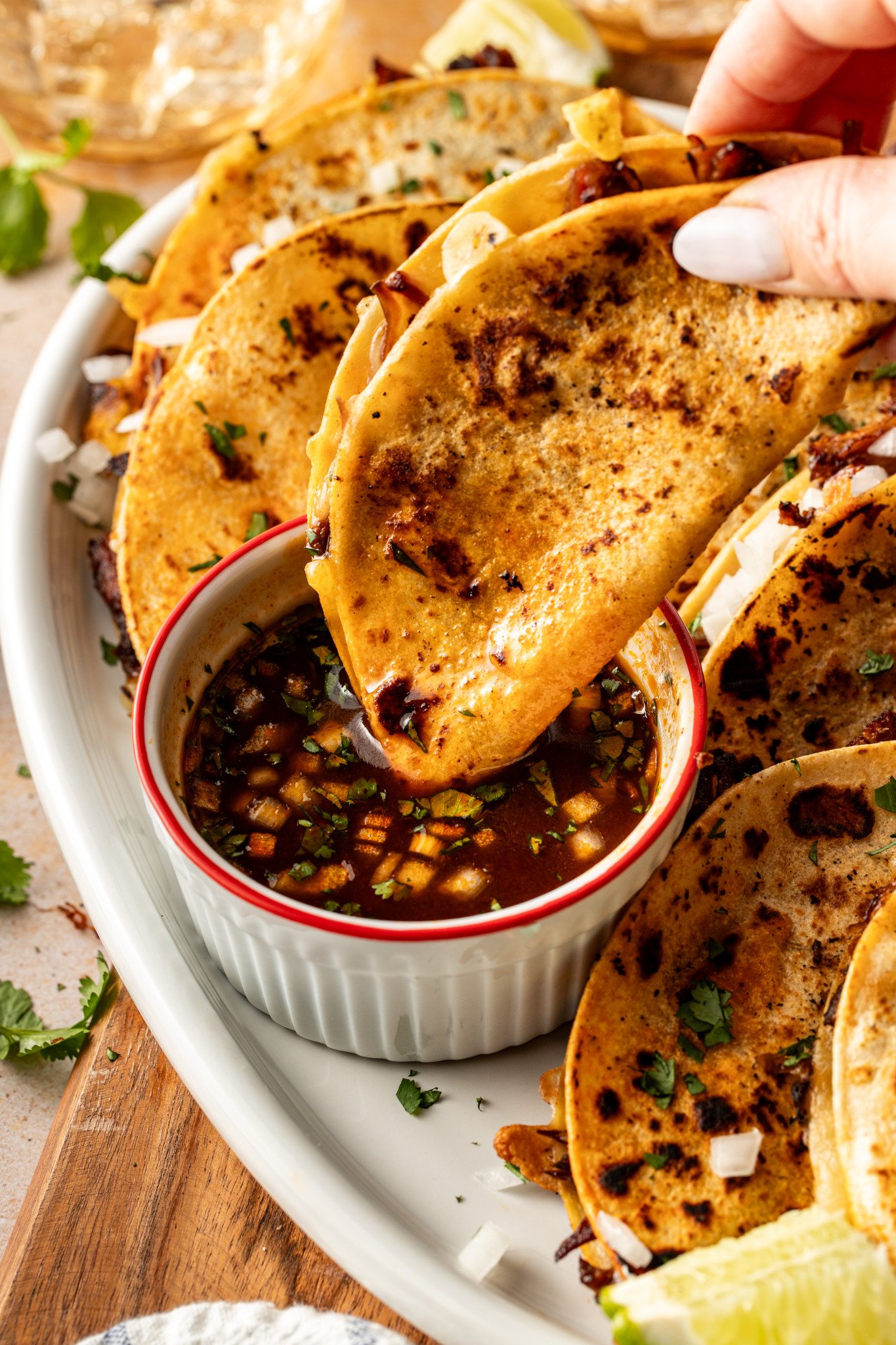 - Warm tortillas = fewer tears. Don’t skip dipping the tortillas in the warm consomé. It adds flavor and also helps to make them pliable so they don’t rip apart when folding them over.