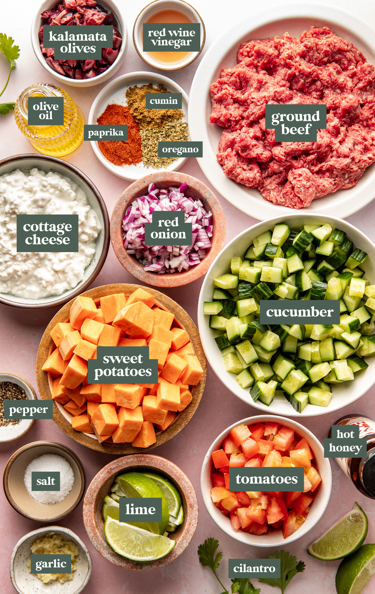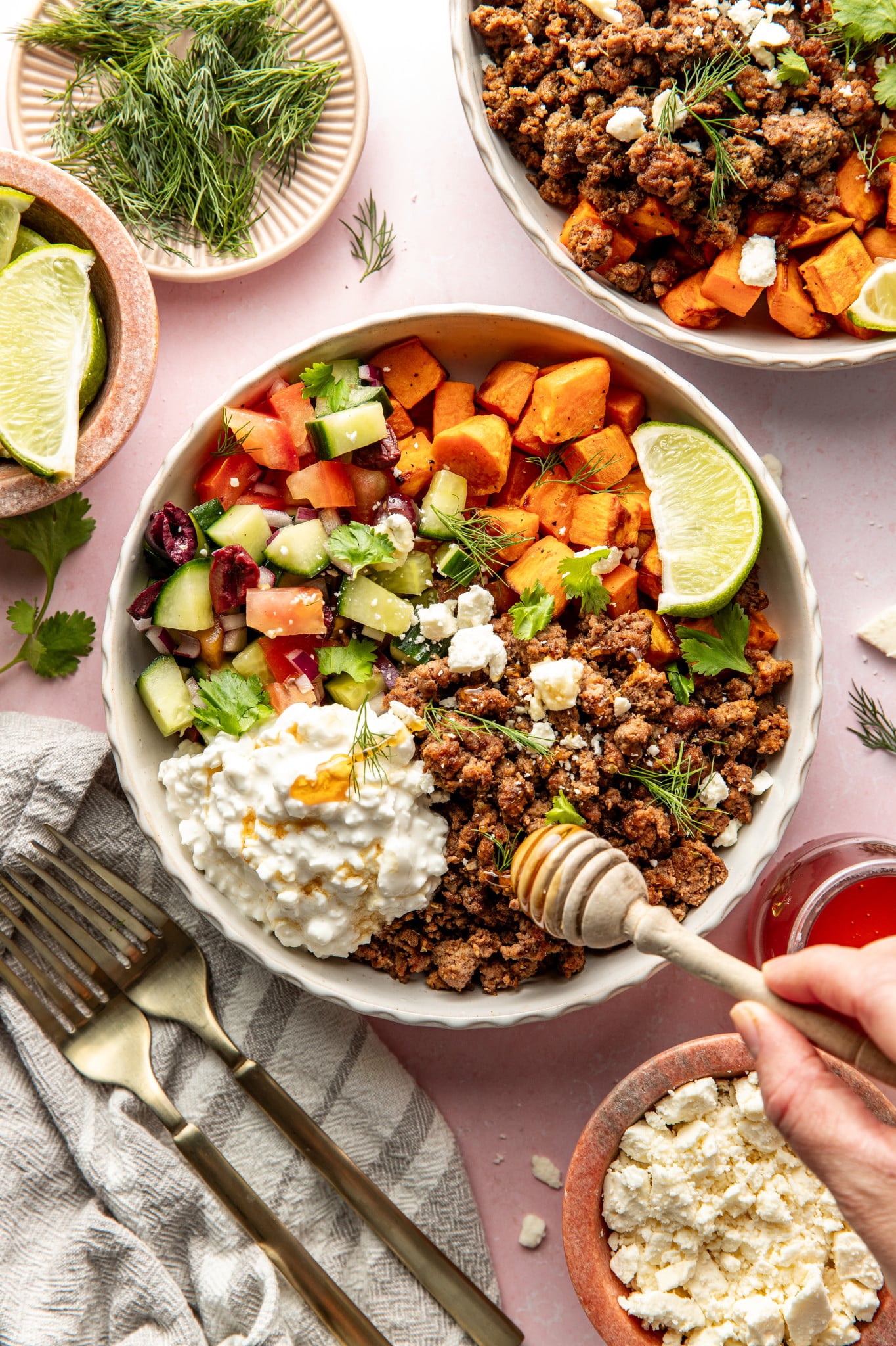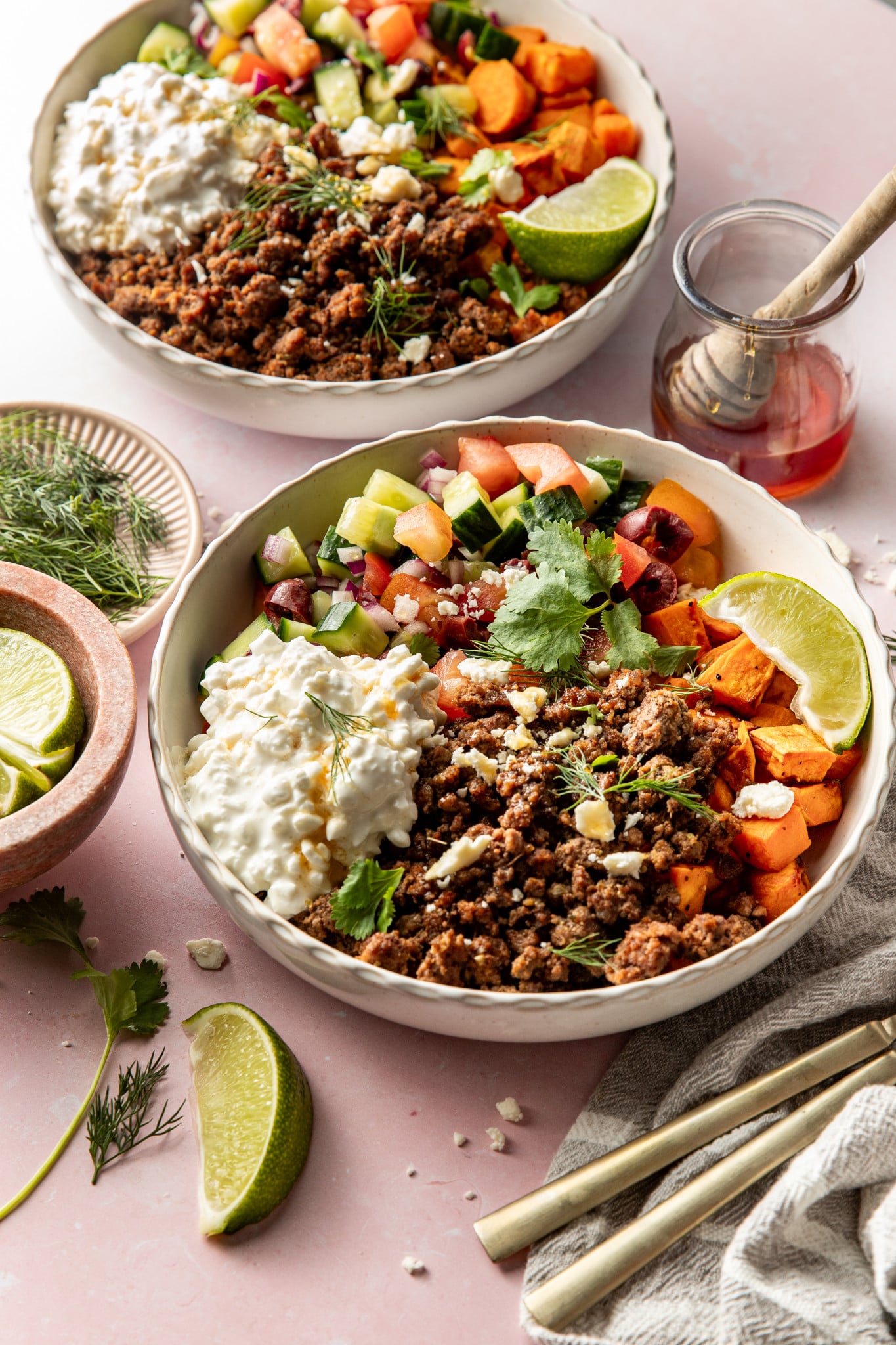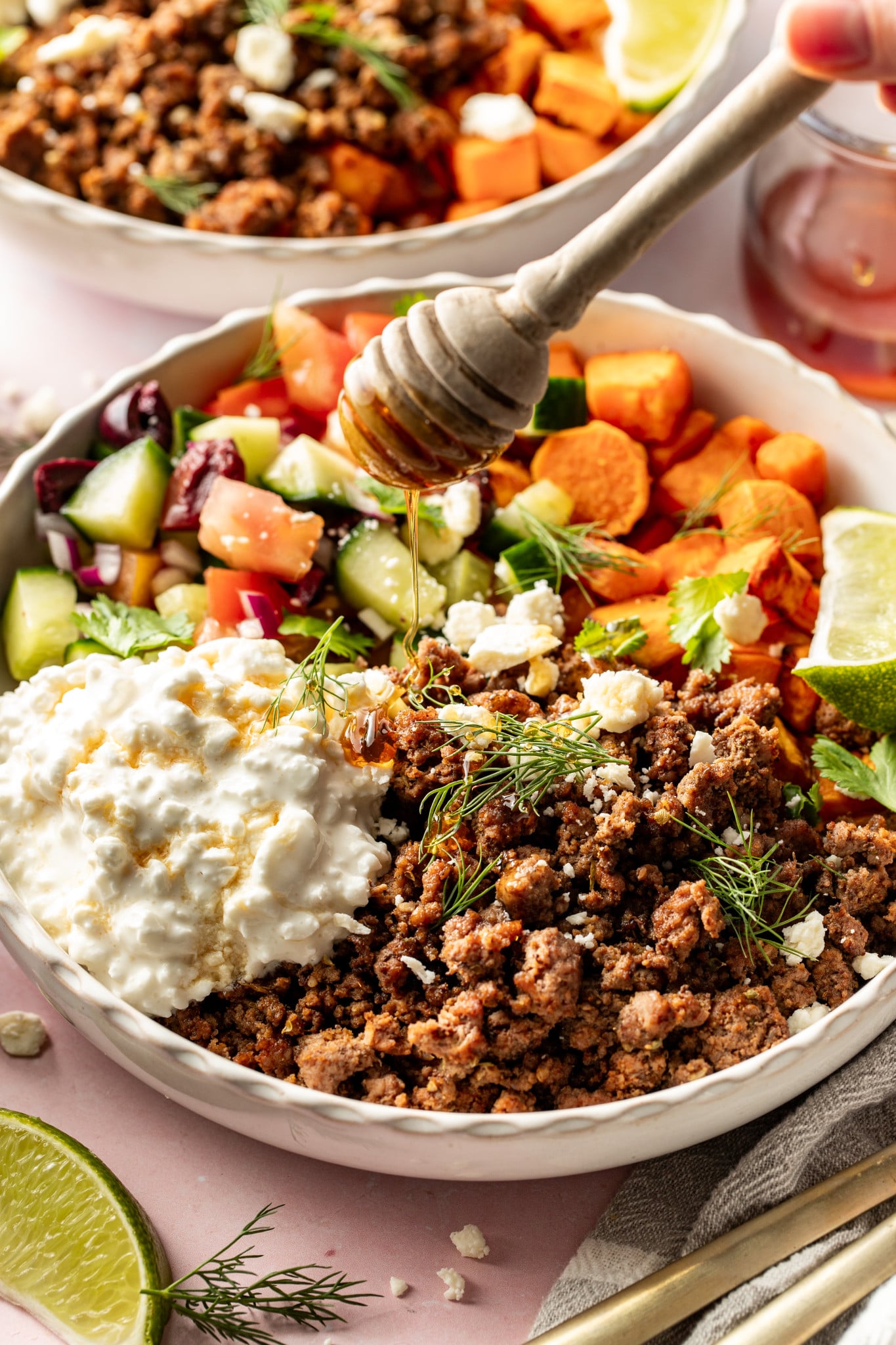 Add the sweet potatoes, ground beef, and cucumber salad to a bowl, then top with a big ol’ scoop of cottage cheese. Garnish with fresh herbs, a squeeze of lime, and definitely don’t forget a generous drizzle of hot honey🤤. Sprinkle with some feta cheese (if desired) and enjoy!!