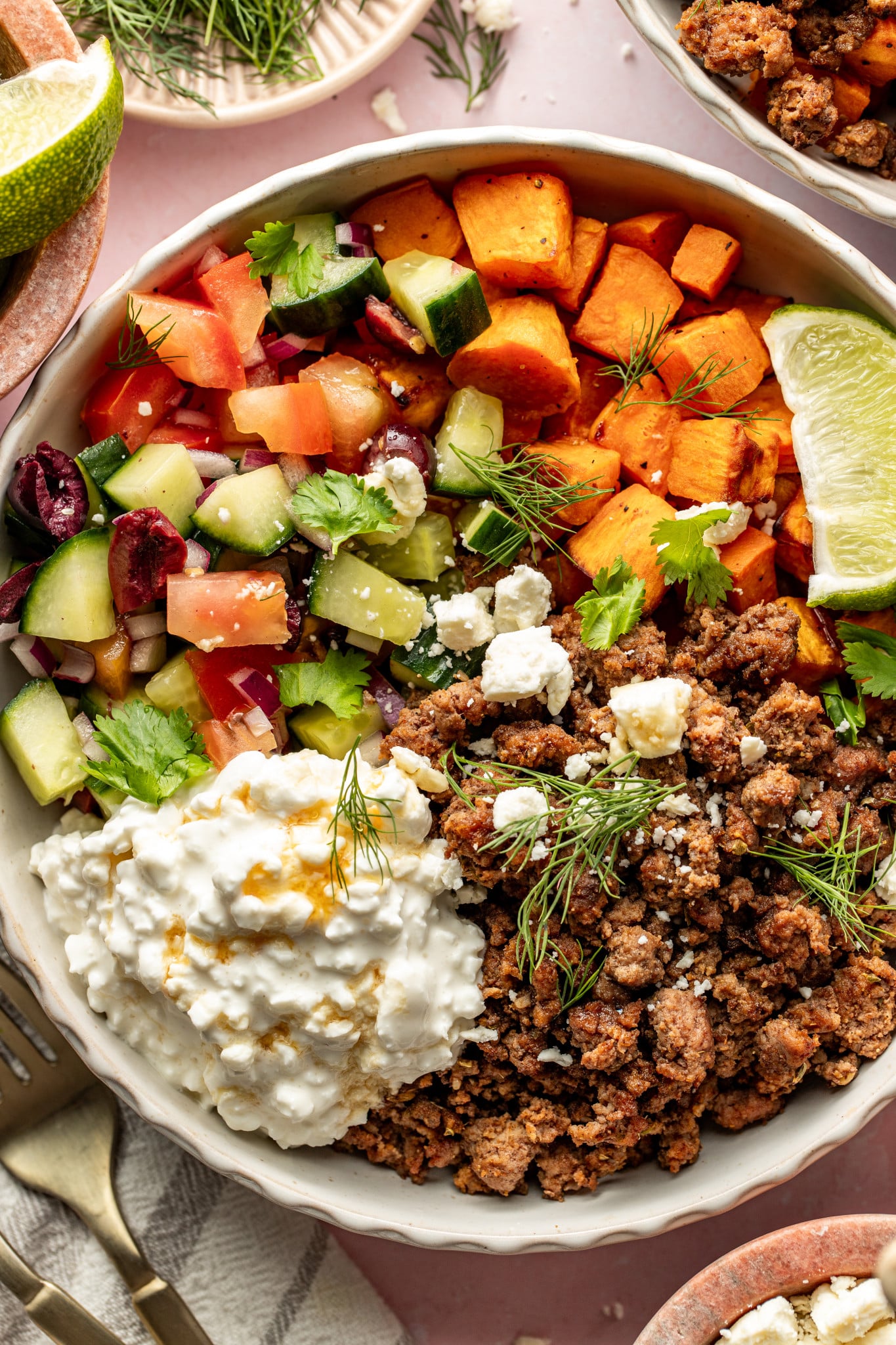 - Assemble the bowls: Divide the crispy sweet potatoes among bowls. Top with seasoned ground beef, a generous scoop of cottage cheese, and the cucumber salad.Cottage cheese