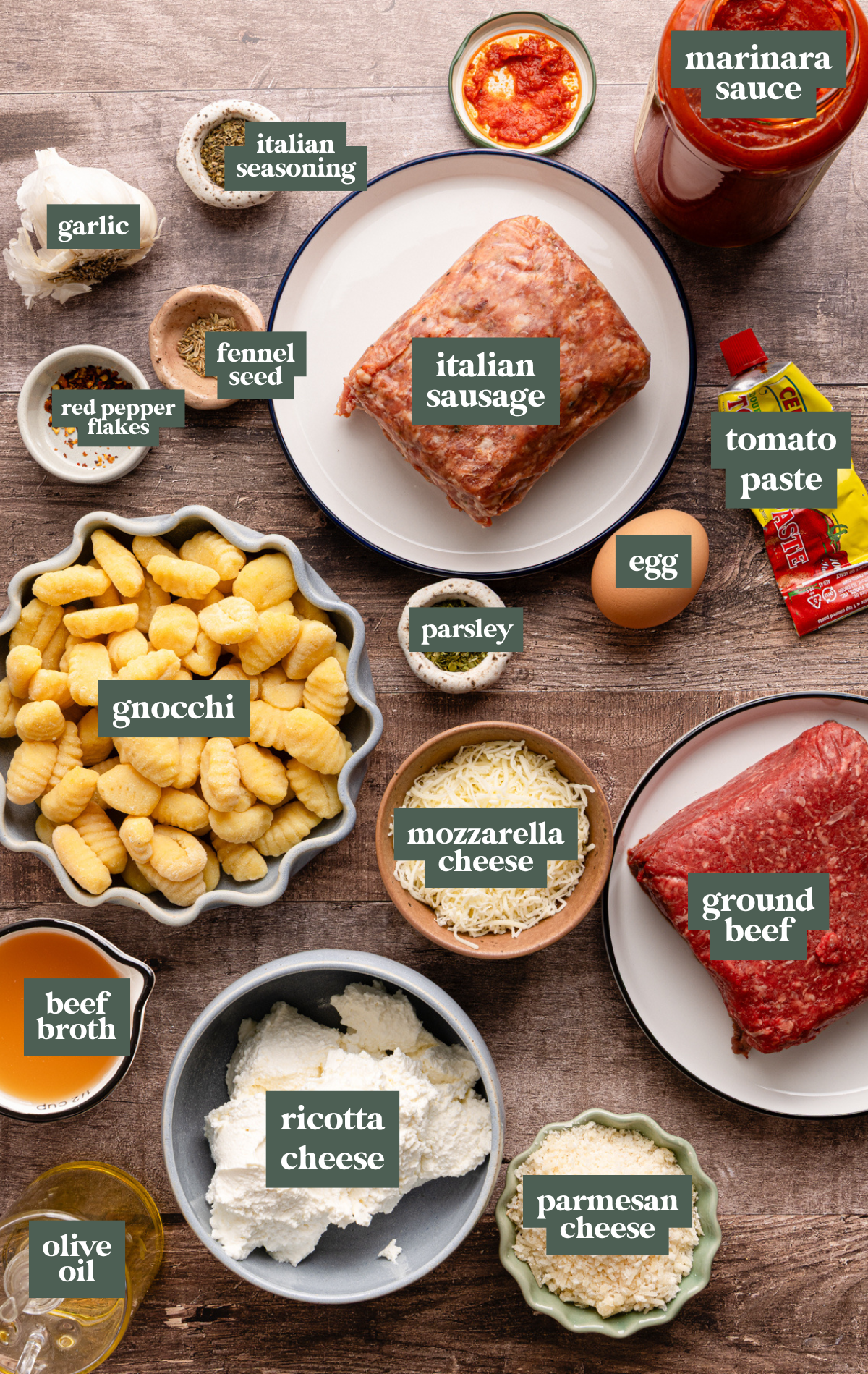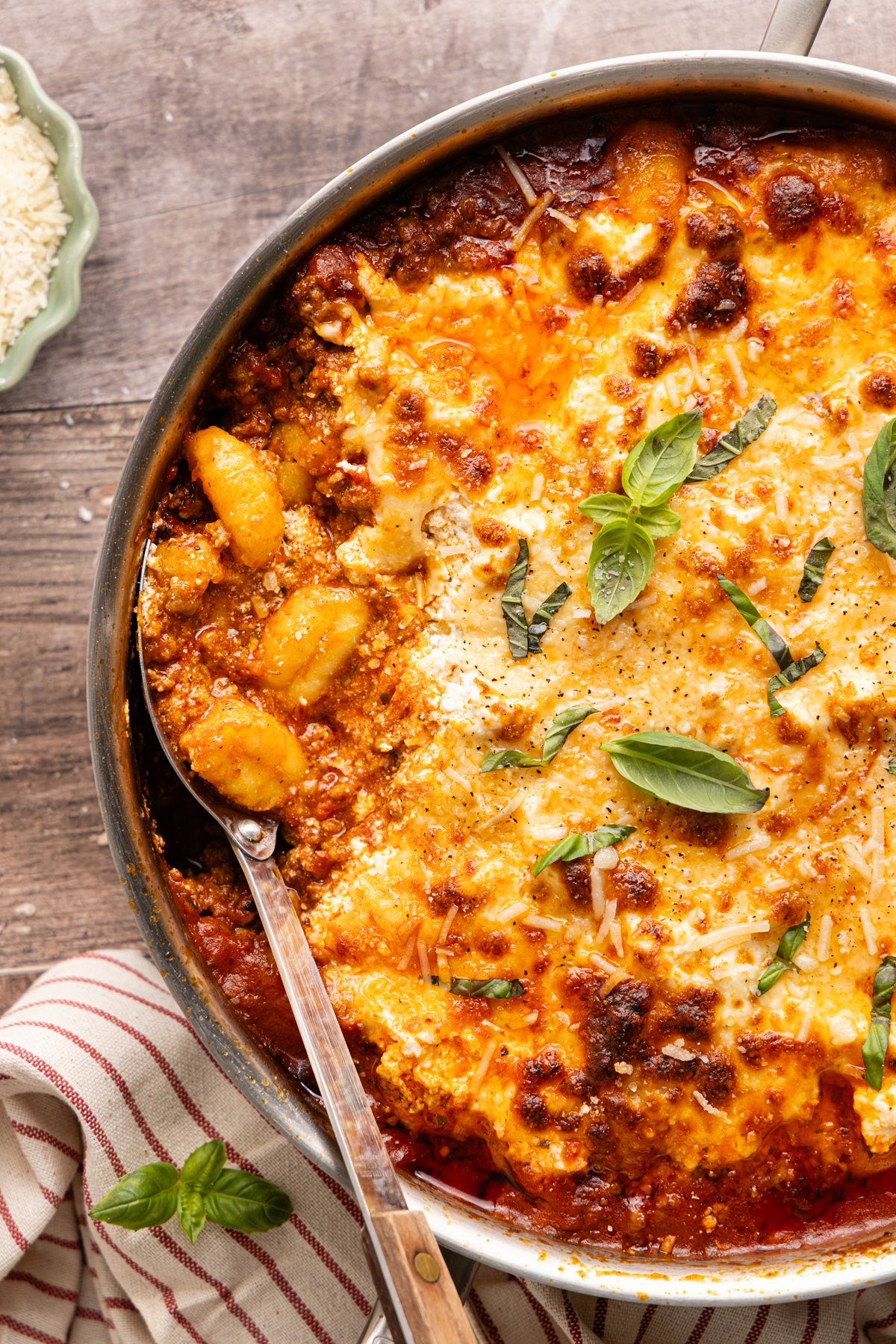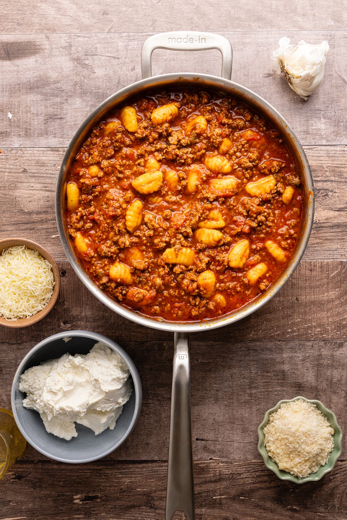 • Gnocchi: I love using soft, pillowy gnocchi in place of traditional lasagna noodles because they are great for soaking up the sauce as they cook and making this dish extra comforting. Plus, no boiling required. You just cook the gnocchi right in the sauce for a few minutes.