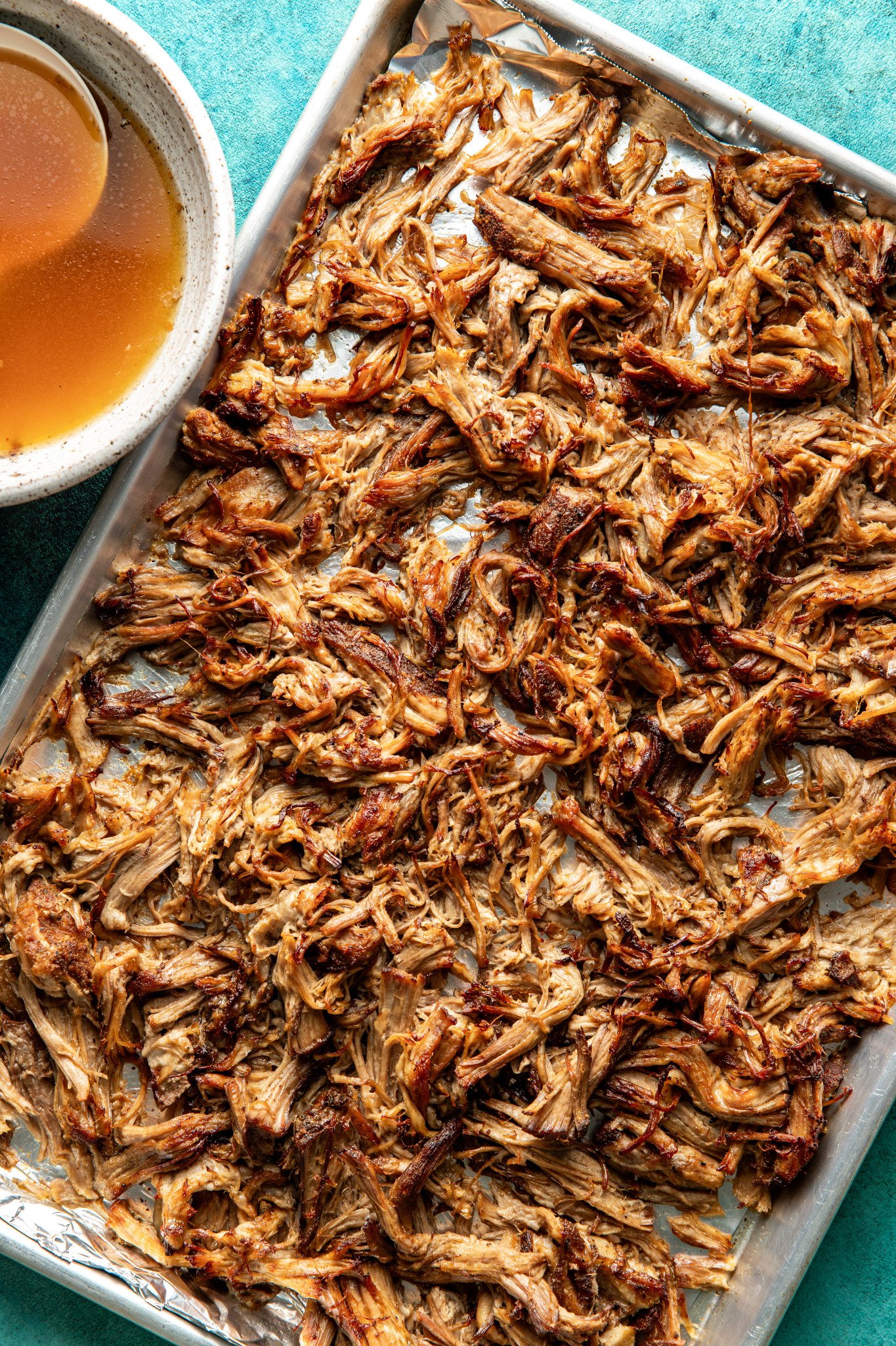 - Broil for crispy edges: Preheat your oven broiler to high. Line a large baking sheet with foil.Spread the shredded pork evenly on the baking sheet. Spoon about 1/2–3/4 cup of the cooking liquid over the meat to keep it juicy. Broil for 5–7 minutes, watching closely, until the edges begin to brown and crisp.