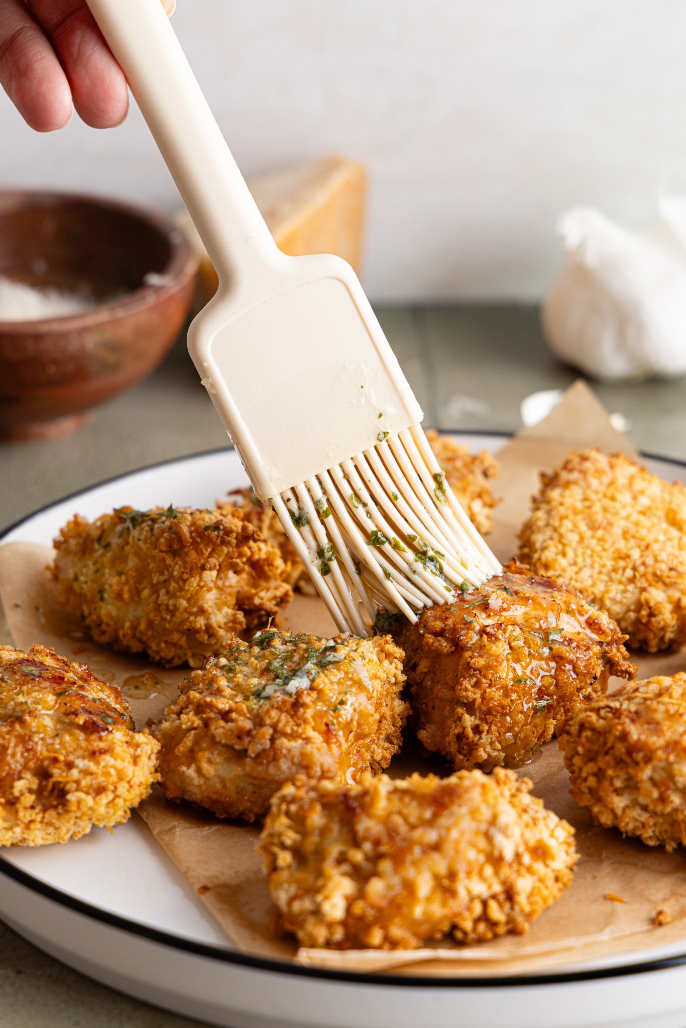 In a small bowl, mix the melted butter with garlic, parsley, and chili flakes. Then brush the garlic butter onto the chicken.