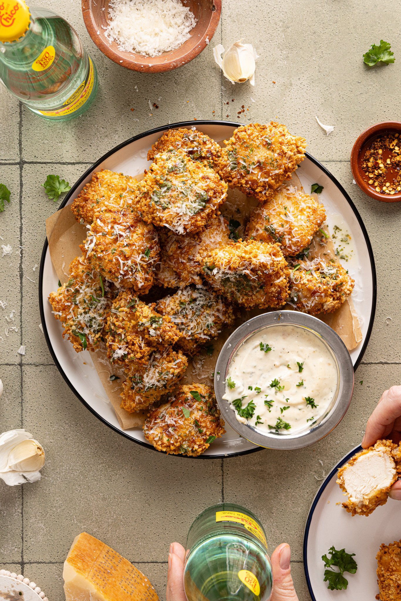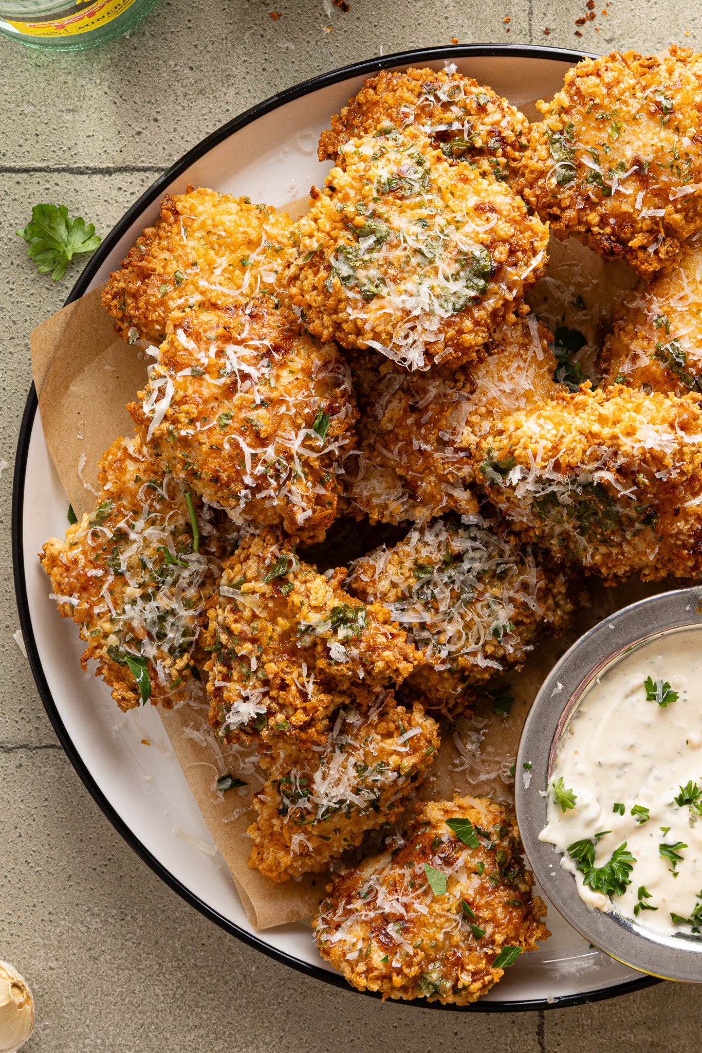 - Finish and serve: Add more parmesan and parsley on top and serve with ranch or garlic aioli. These are really good as an appetizer or wrapped up in a tortilla wrap with lettuce, tomatoes, aioli, and cheese.More grated Parmesan to garnish on top