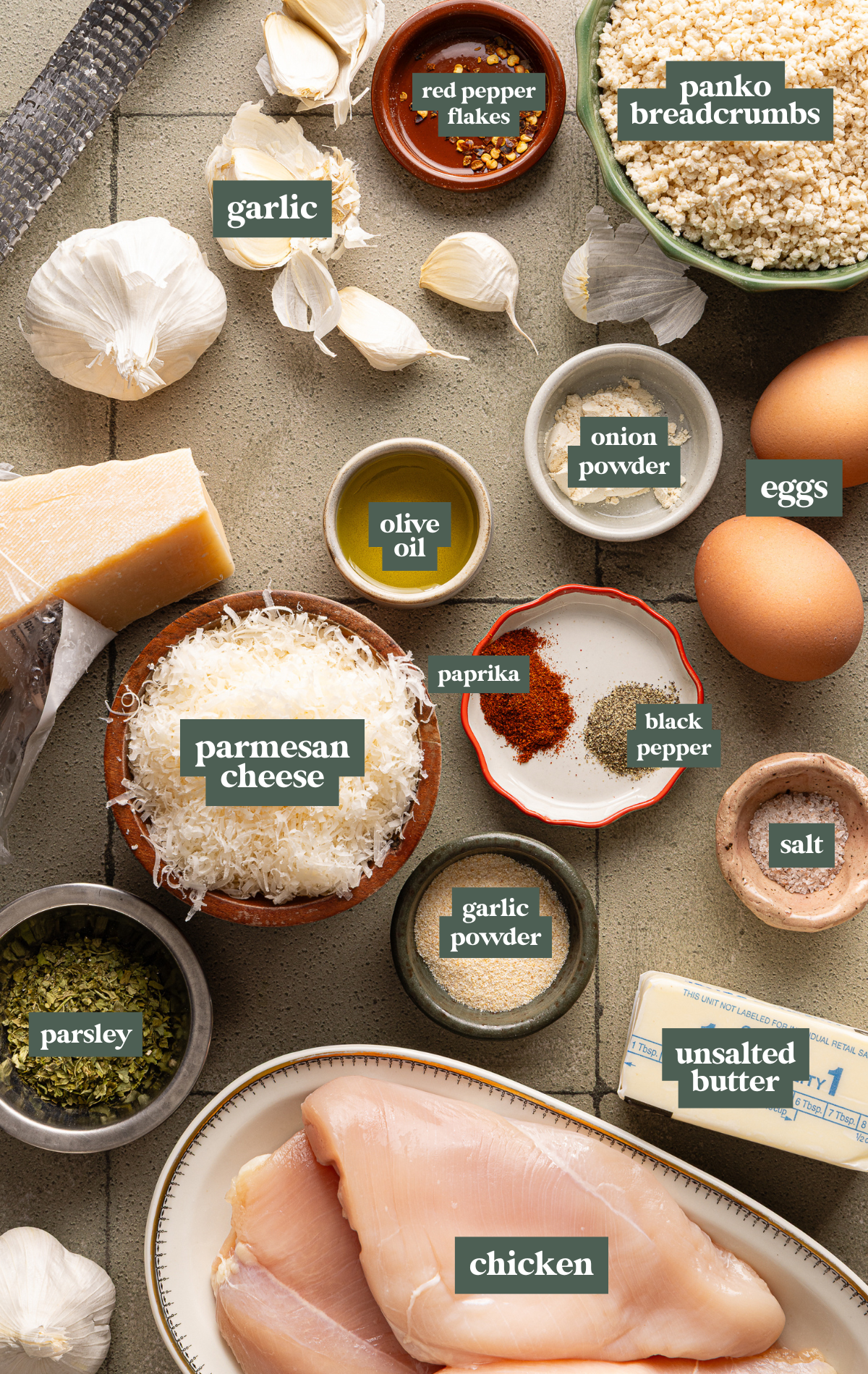 - Set up dipping station: Mix the breadcrumbs and parmesan together in a bowl, and whisk the eggs in another bowl.1¾ cup panko breadcrumbs, 1 cup freshly grated parmesan, 2 large eggs