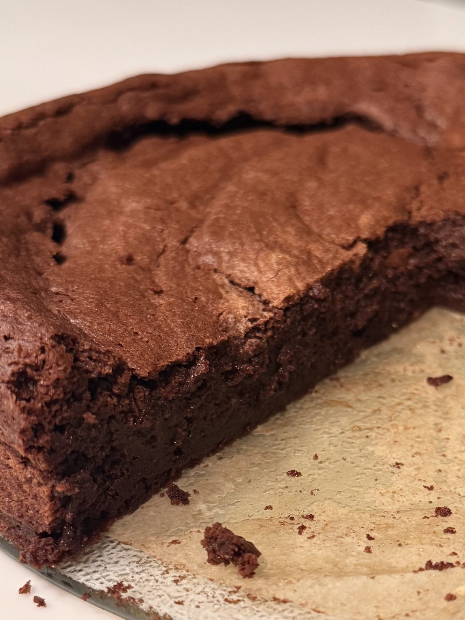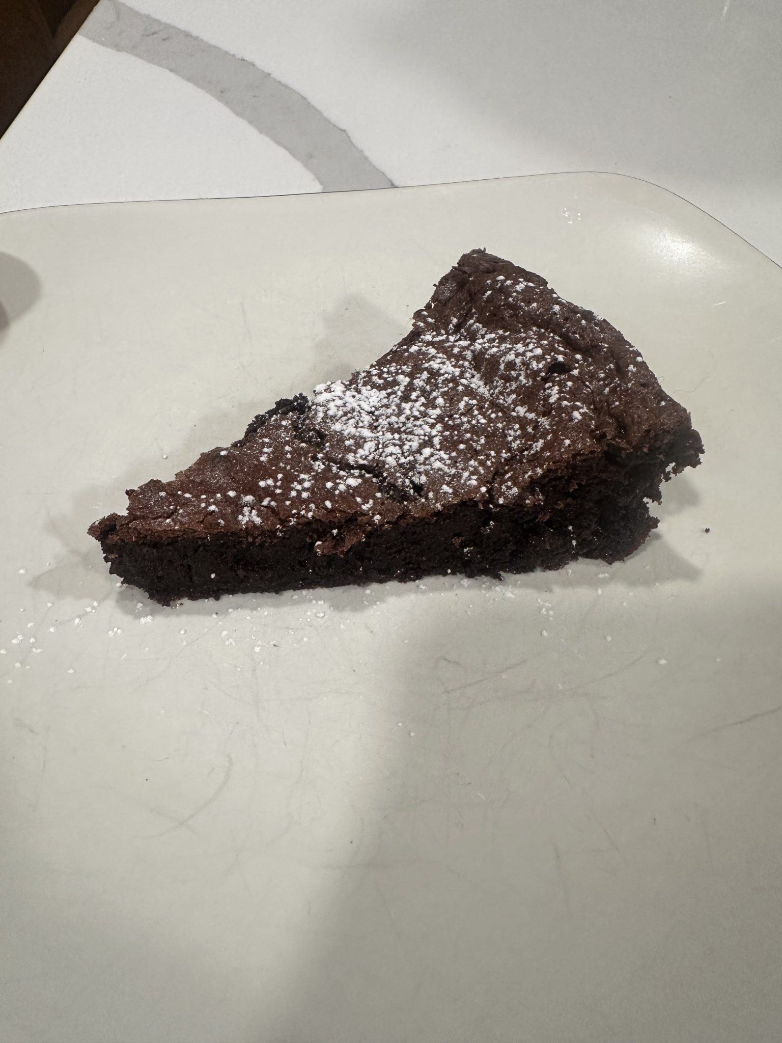 Bake until the edges are set and the center is just slightly soft, then let the cake cool completely — it will sink as it cools and that’s exactly what you want. Chill before slicing for the best texture, then serve with cocoa powder, whipped cream, or fresh berries.