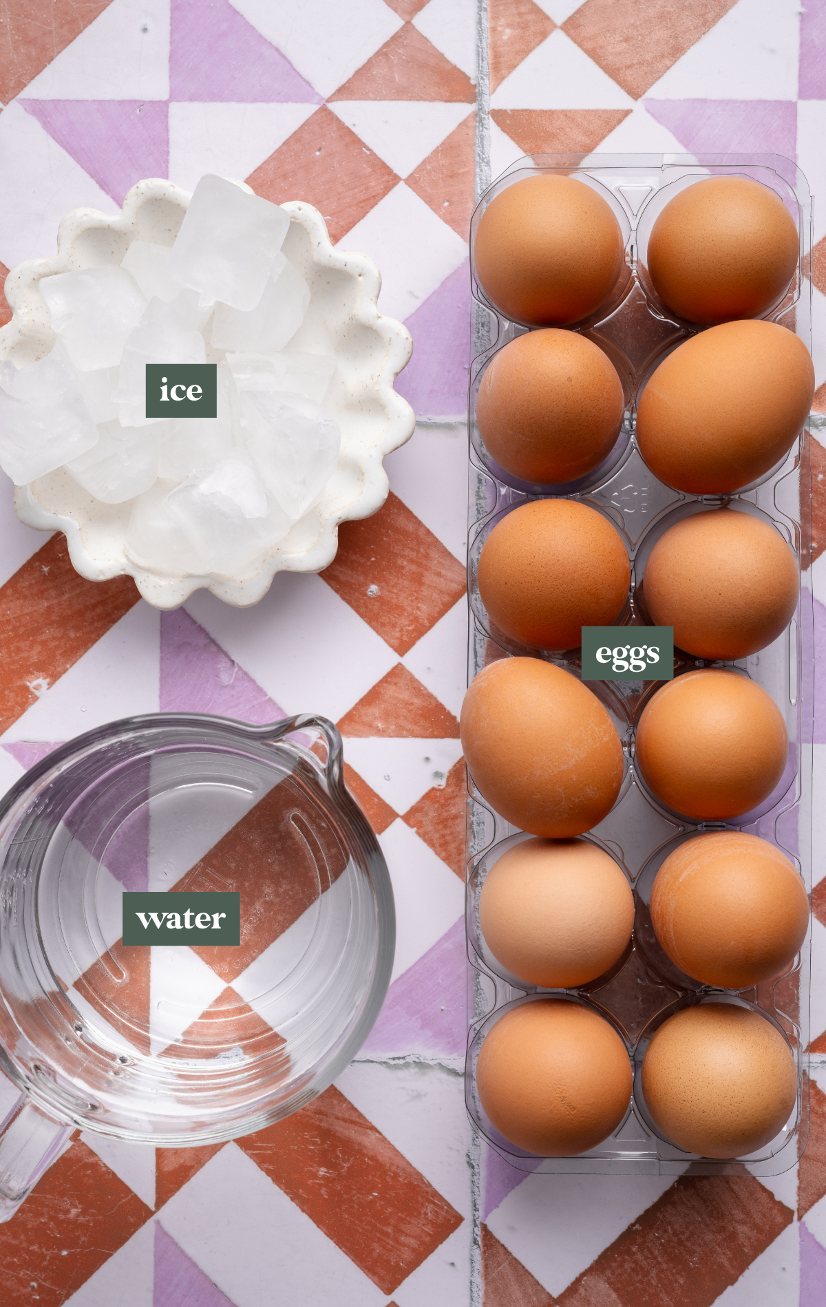 • Water: You’ll need enough water to fully submerge the eggs. Roughly 3 quarts in a large pot works well for 6-12 eggs. No need to add vinegar or baking soda to the water. If you follow these cooking and chilling instructions, the eggs will peel beautifully without anything extra added to the water.