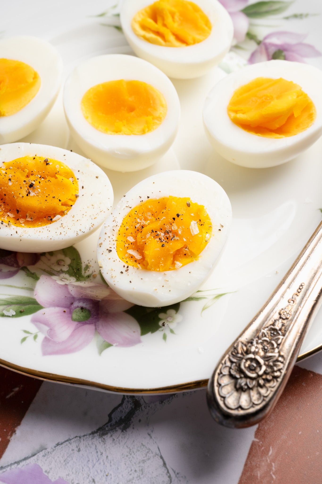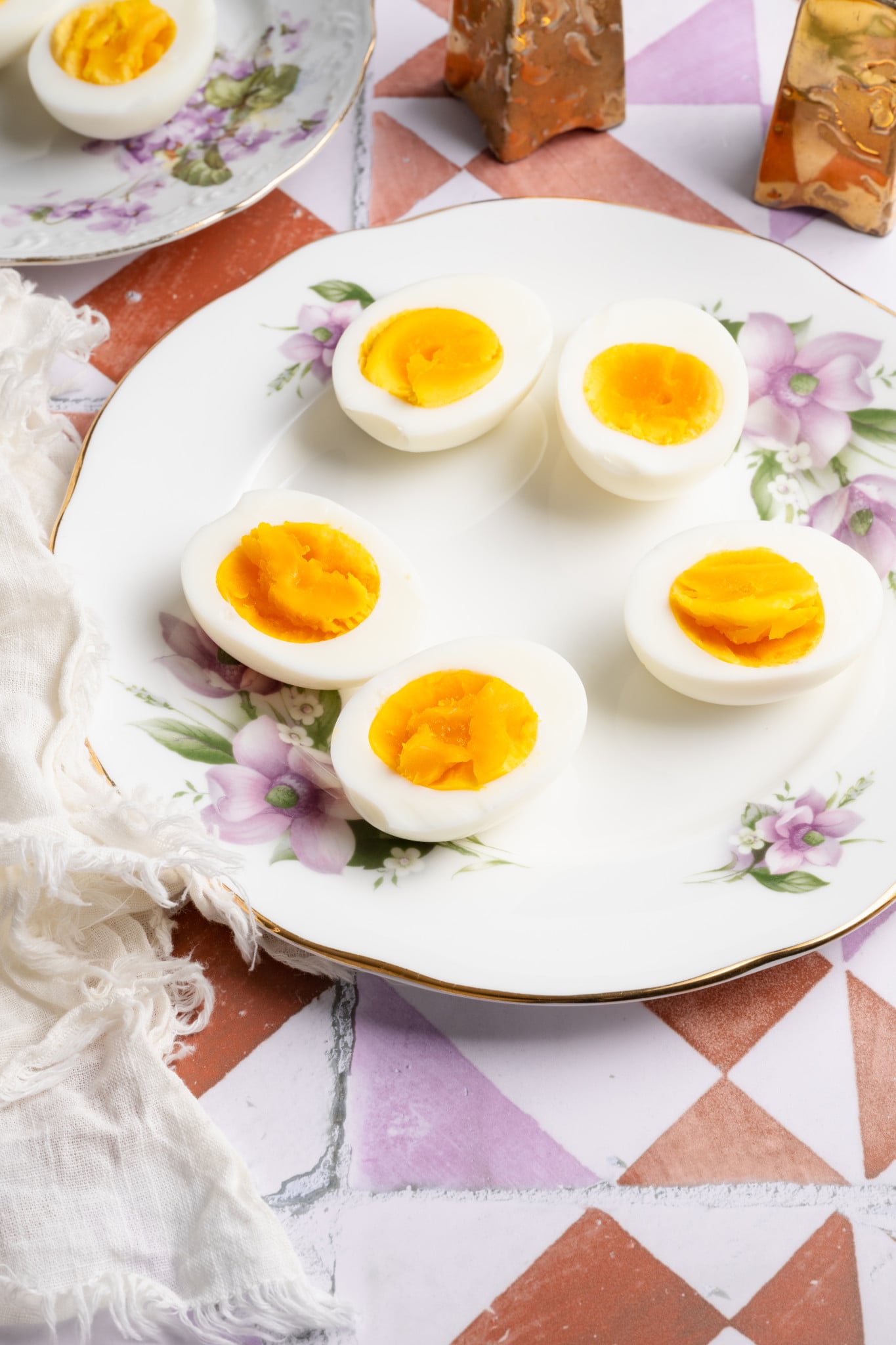 Three air fryer hard boiled eggs on a floral plate.