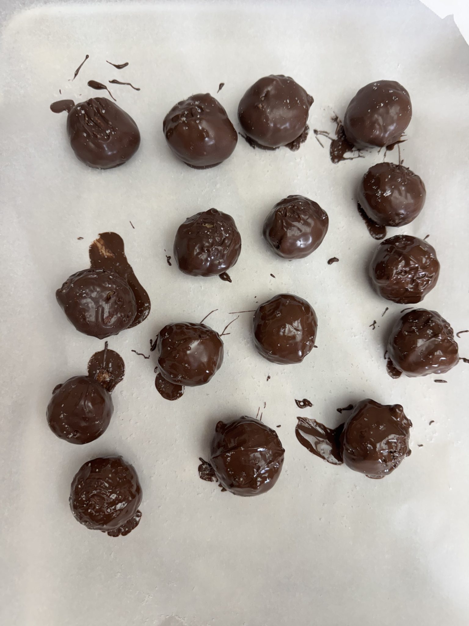 - Dip the bites: Using a fork, roll each chilled bite in the melted chocolate, allowing any excess to drip off. Return them to the parchment-lined tray and immediately sprinkle with Maldon flaky sea salt, if desired.Maldon flaky sea salt