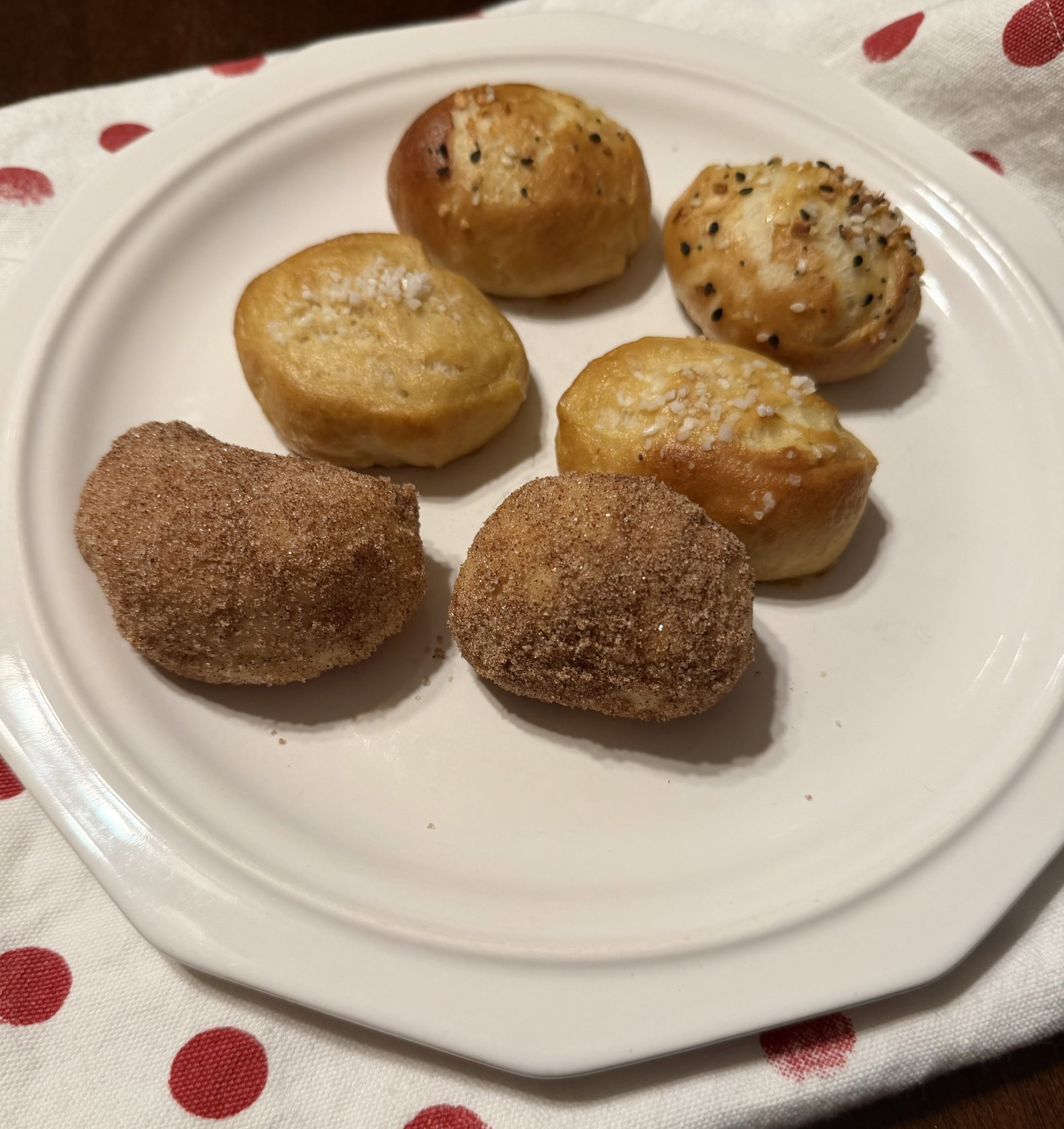 These were yummy! I did prefer the cinnamon ones. I forgot to add the salt with the cinnamon sugar, so added it after – oops added a bit too much, so they are salty sweet but deliciously addictive. Oh, I also cheated, I didnât dip the cinnamon in butter first, I just put the bites in a big bowl and tossed them well with melted butter, then tossed with the cinnamon sugar.