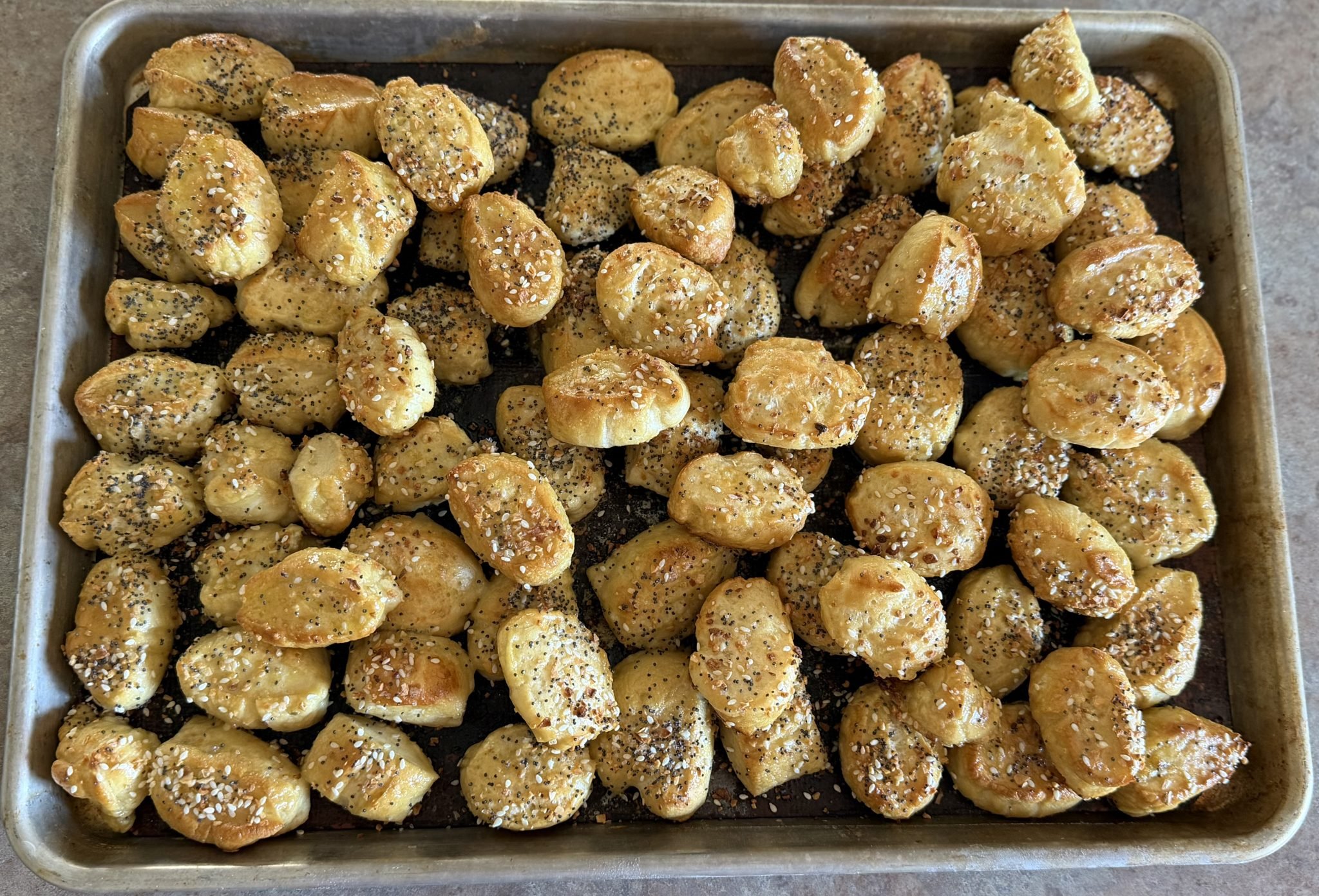 - Everything But the Bagel Seasoning: Adds savory crunch and bold flavor with sesame, garlic, and onion. Bites with this seasoning pair perfectly with cheese sauce or mustard.