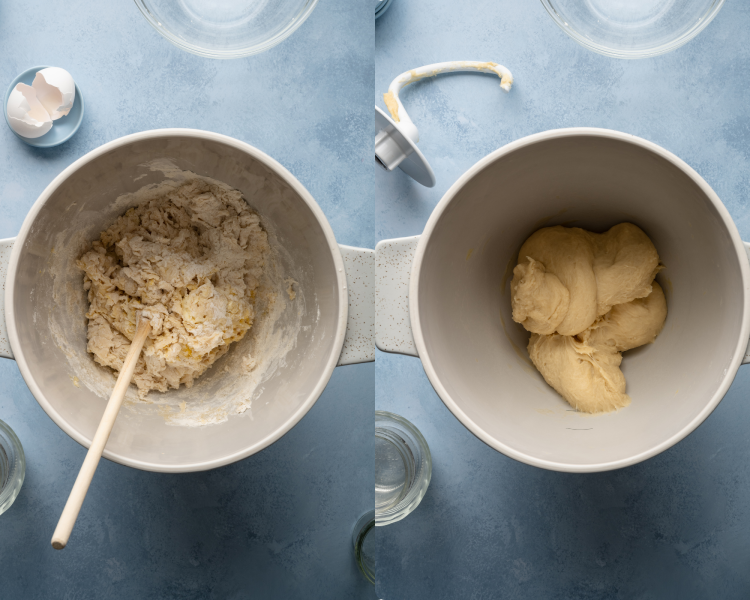 - Knead: add the dough hook and knead for ~6-8 minutes or until it is soft, yet smooth. Tacky is okay but it shouldn’t be overly sticky.