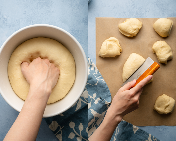 - Divide the dough: Gently punch down the dough and turn the dough out onto a clean work surface. Use a bench scraper to divide the dough into 8 sections, ~100 grams each.