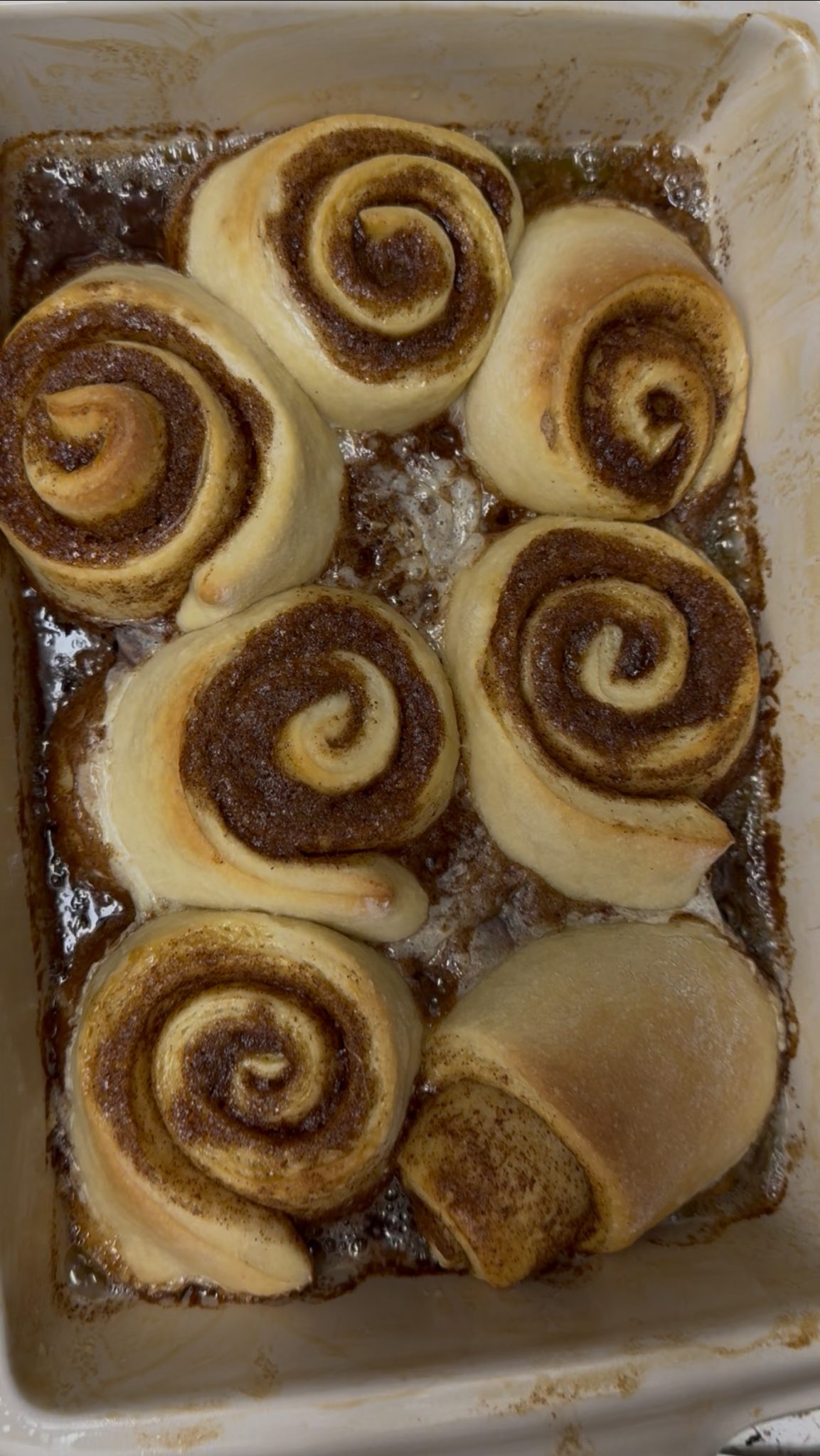 Overhead view of freshly baked cinnamon rolls in a white oval baking dish. The rolls are golden brown with visible cinnamon swirls and slightly caramelized edges.