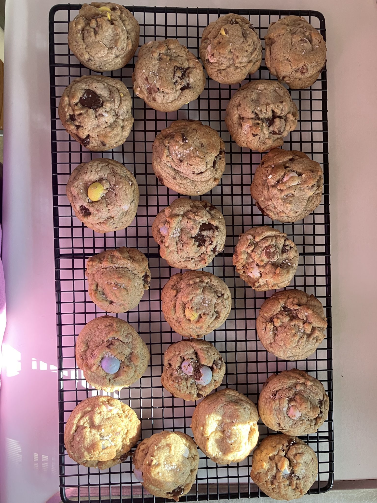 My soft and chewy Easter Sheet Pan cookies are packed with melty chocolate chips and festive Cadbury Mini Eggs—perfect for Spring baking and Easter! They’re made in one bowl, no chill time necessary, and baked all on a single sheet pan. You can get 24 cookie bars (or more if you want to make the squares a little smaller!)