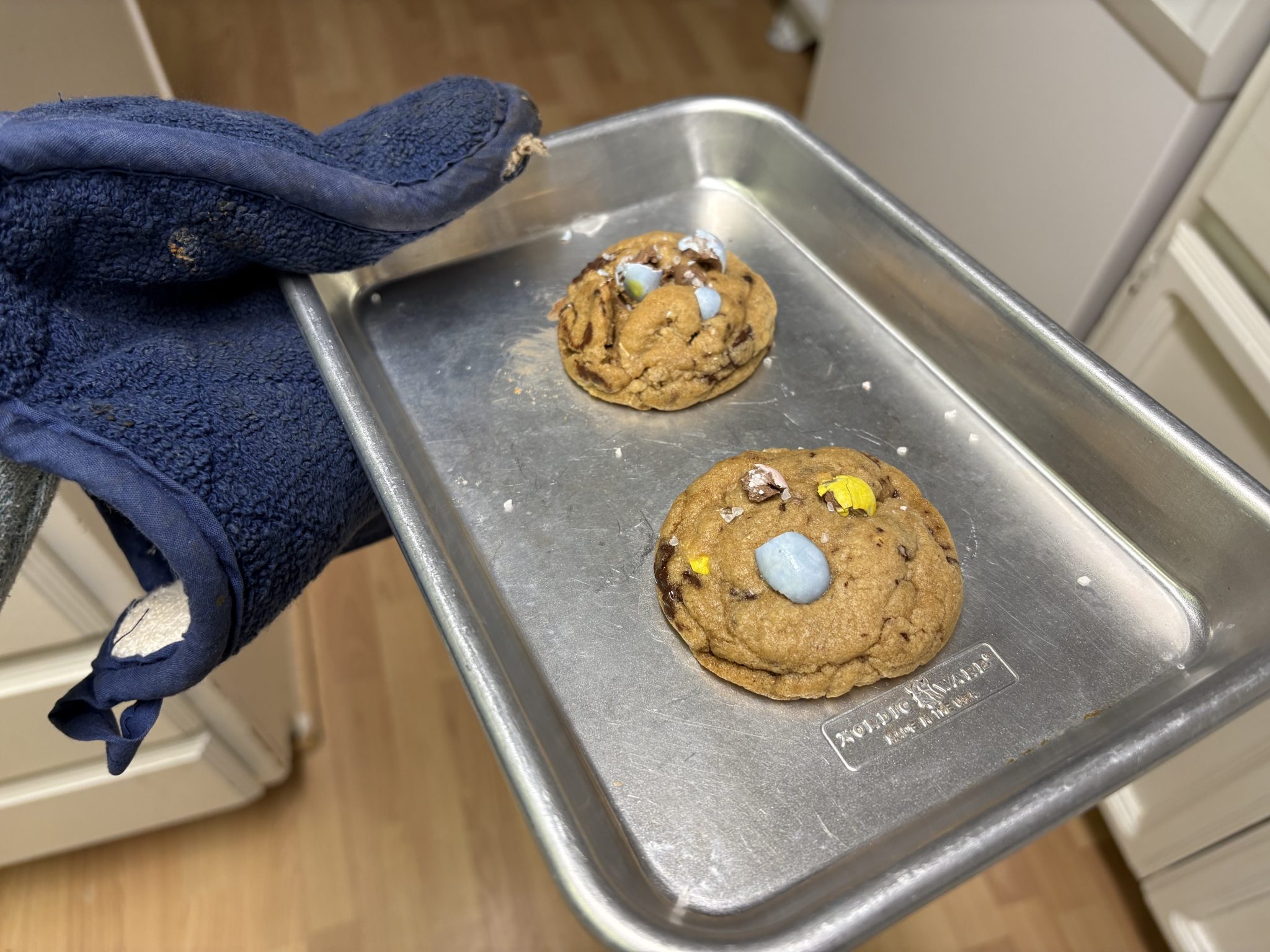 - Scoop: Use a large scoop (about 3 Tbsp per cookie) and place dough on a parchment-lined baking sheet. Press a few extra Cadbury pieces on top (or just dunk the cookie dough ball into the chopped Cadbury eggs) – you can gently press the cookies down for a flatter cookie, or leave them in a ball for a slightly thicker cookie.