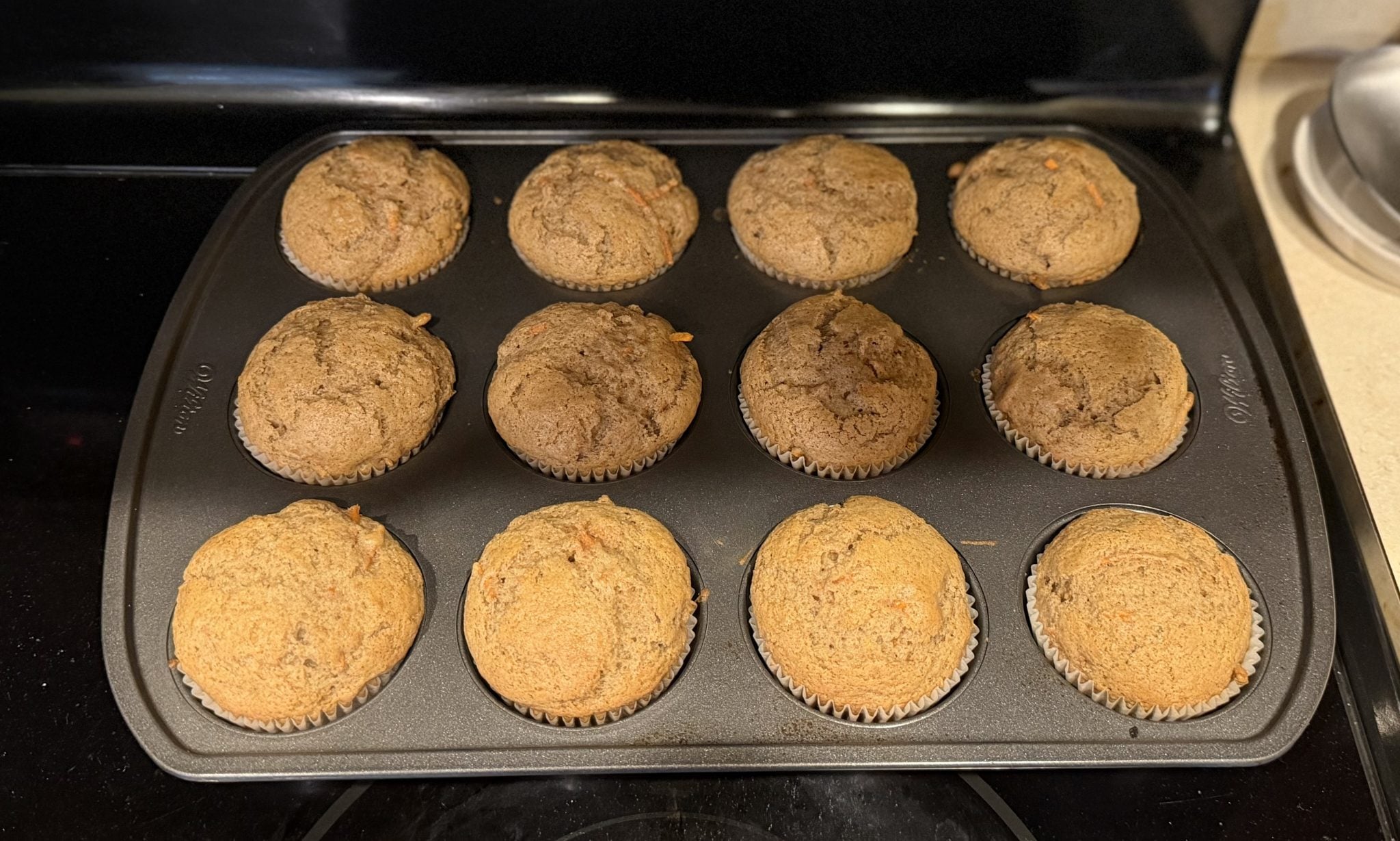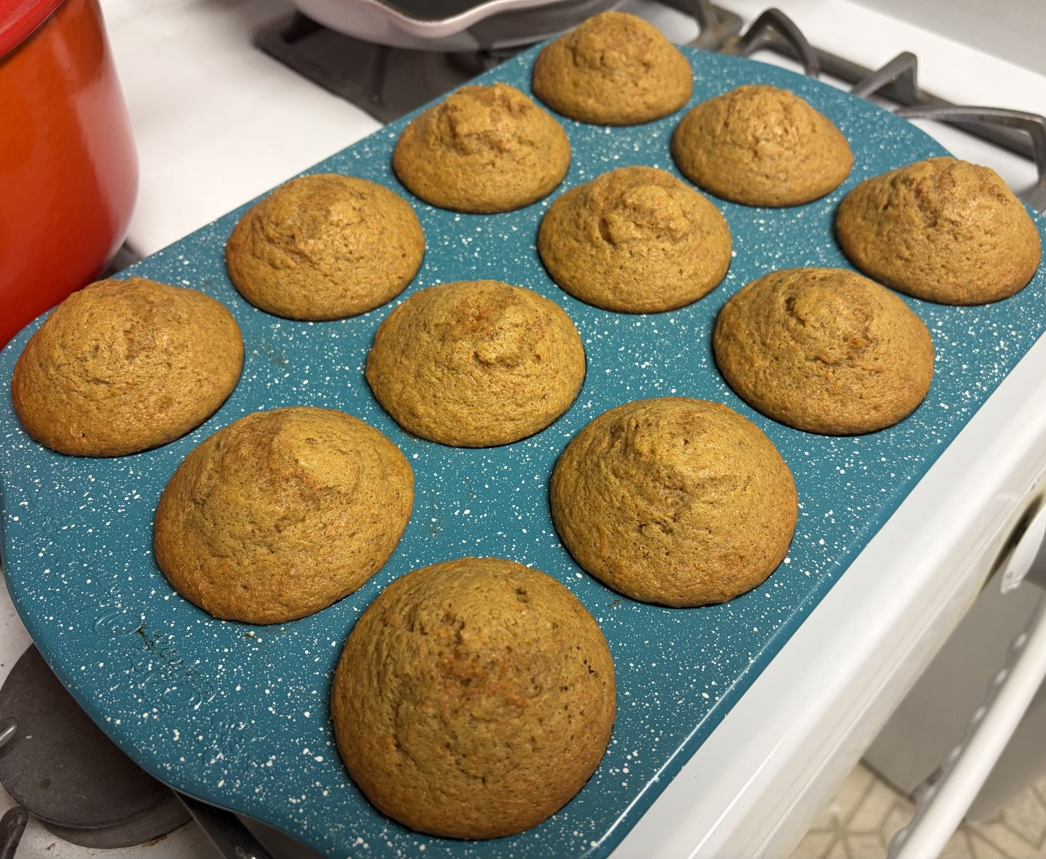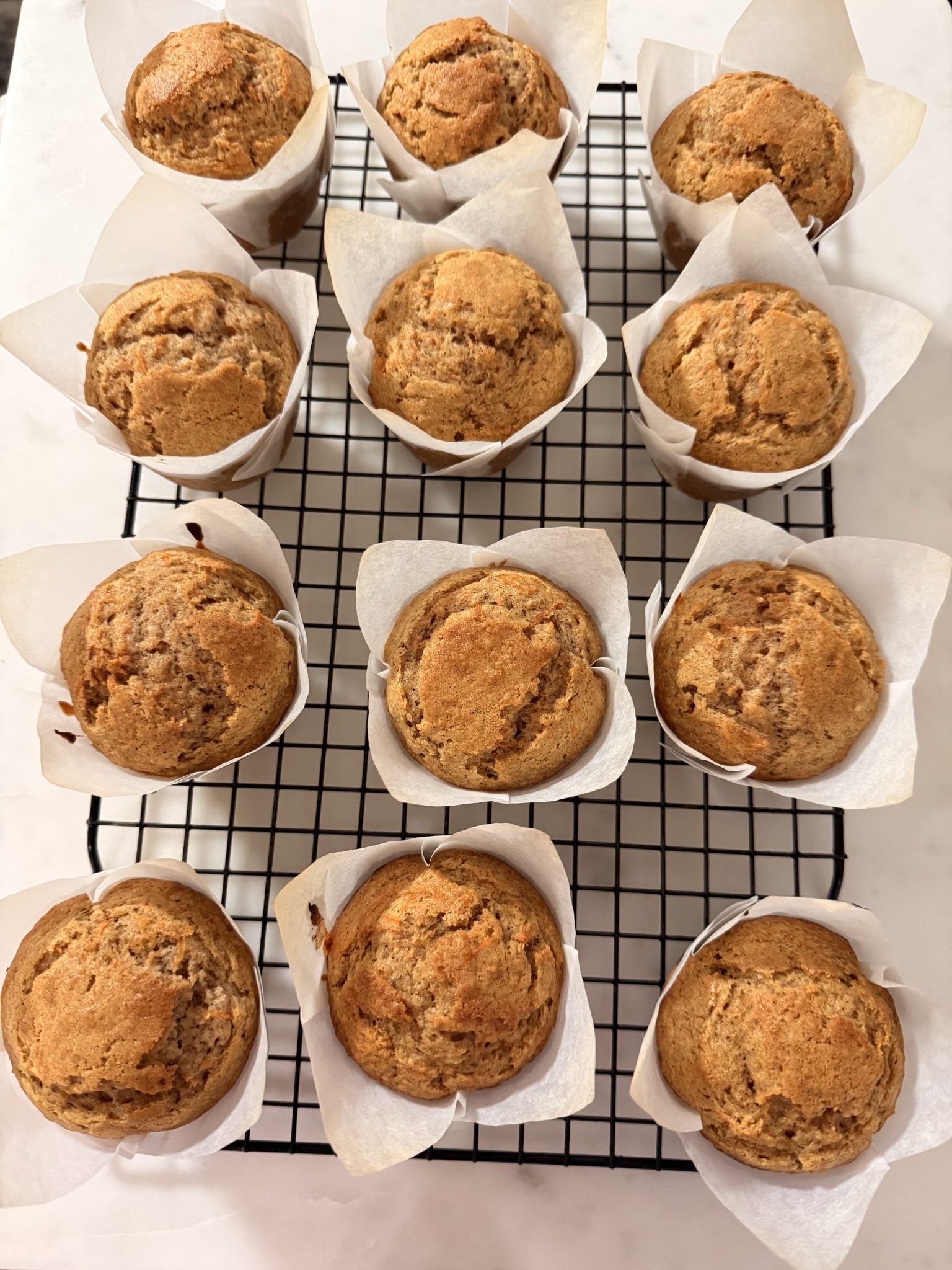 They’re packed with freshly grated carrots and warm spices, giving you that classic carrot cake flavor in every bite, but with a lighter, fluffier texture that feels perfectly balanced. The combination of oil and sour cream keeps them incredibly moist, while a quick blast of high heat at the start creates those beautiful bakery-style tops.