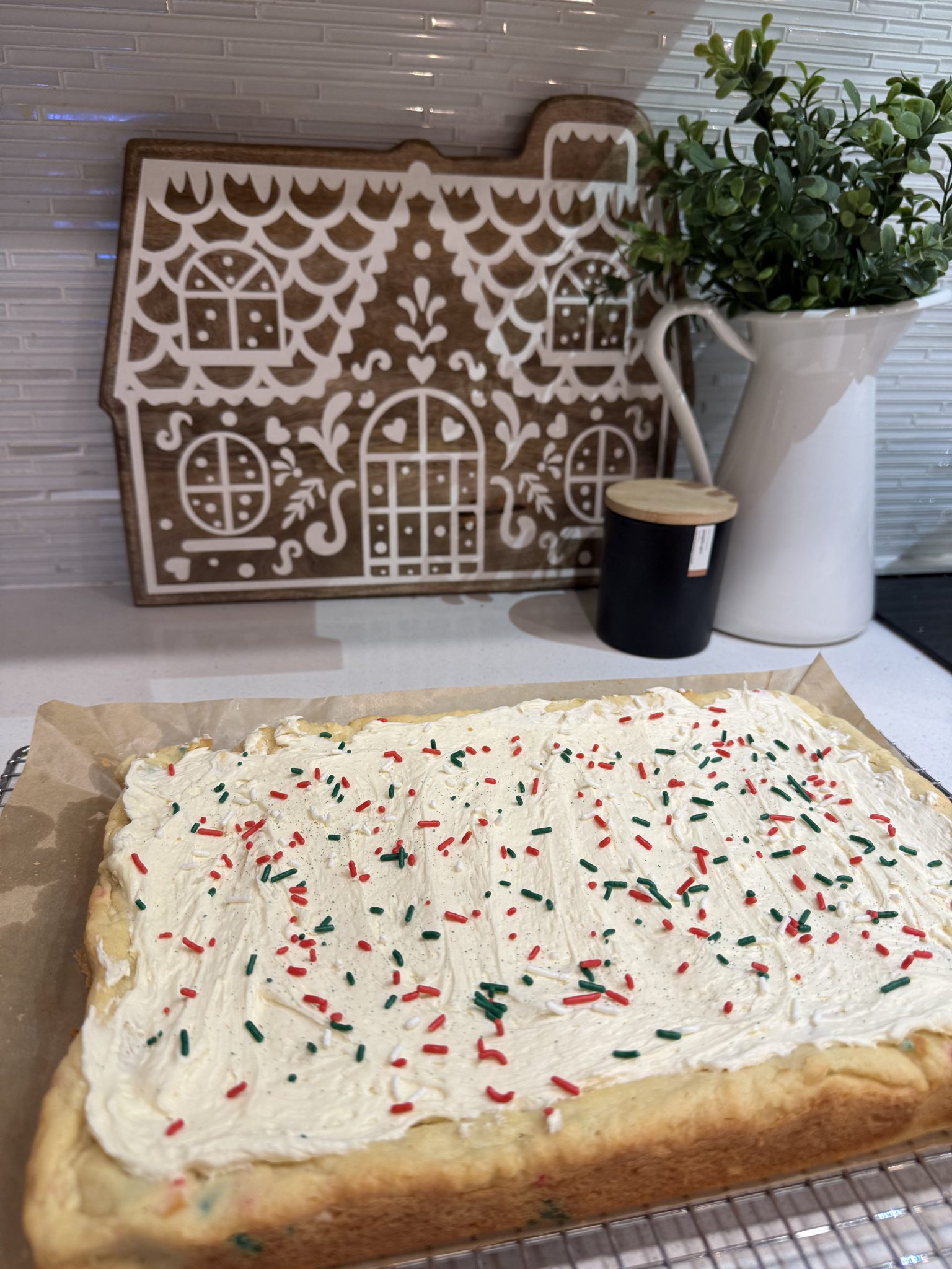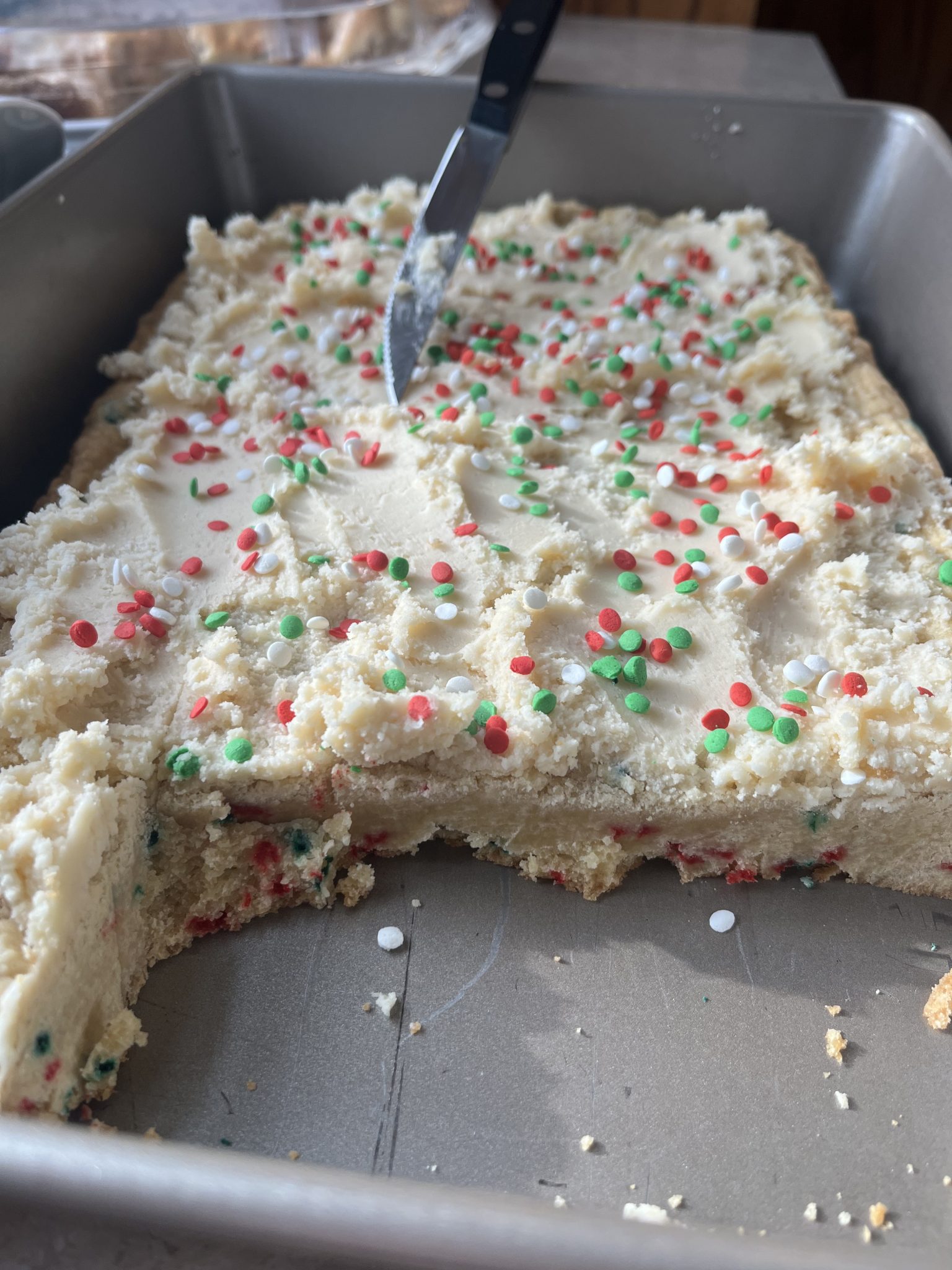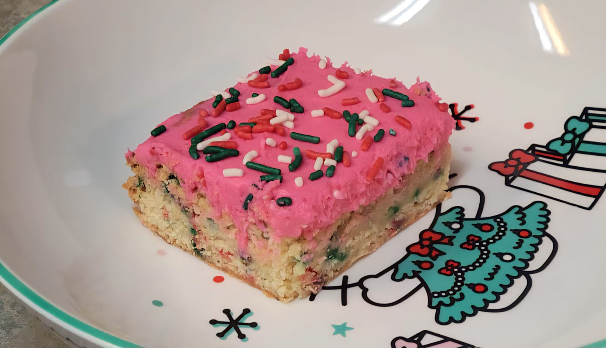 - Frost & Decorate: Spread frosting evenly over cooled cookie bars and top with additional sprinkles. Slice into squares and enjoy!additional Christmas sprinkles