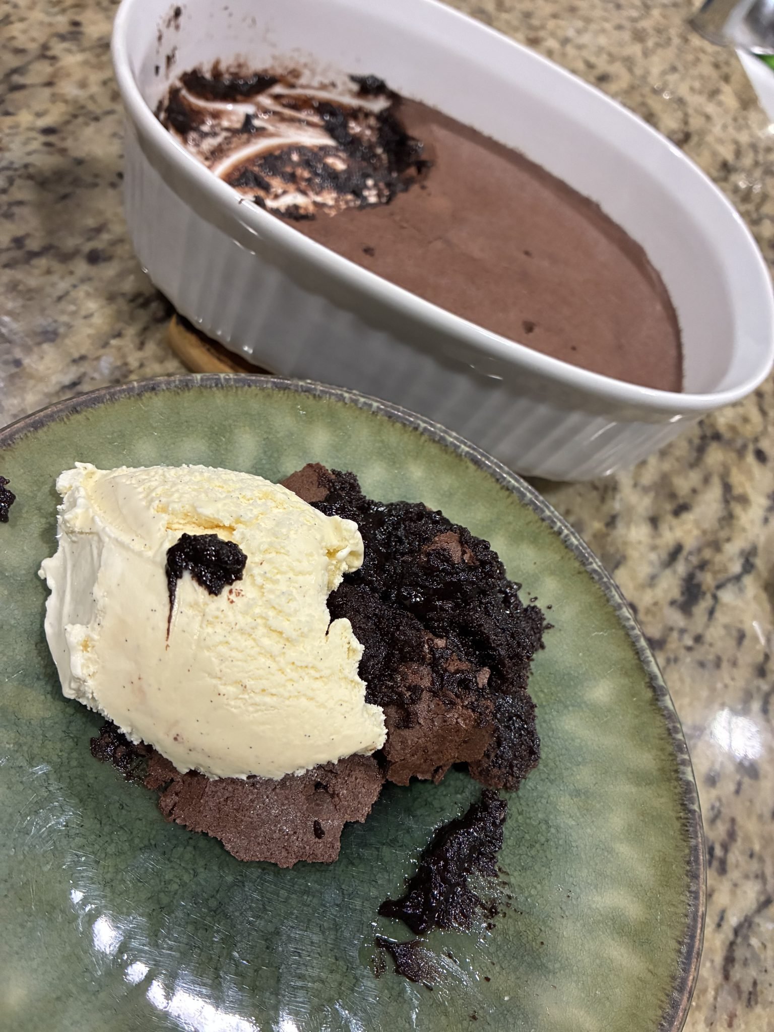 Bake for ~40-50 minutes. Allow it to cool some in the water bath, then lift it out and serve with your favorite vanilla ice cream and enjoy. YUM!