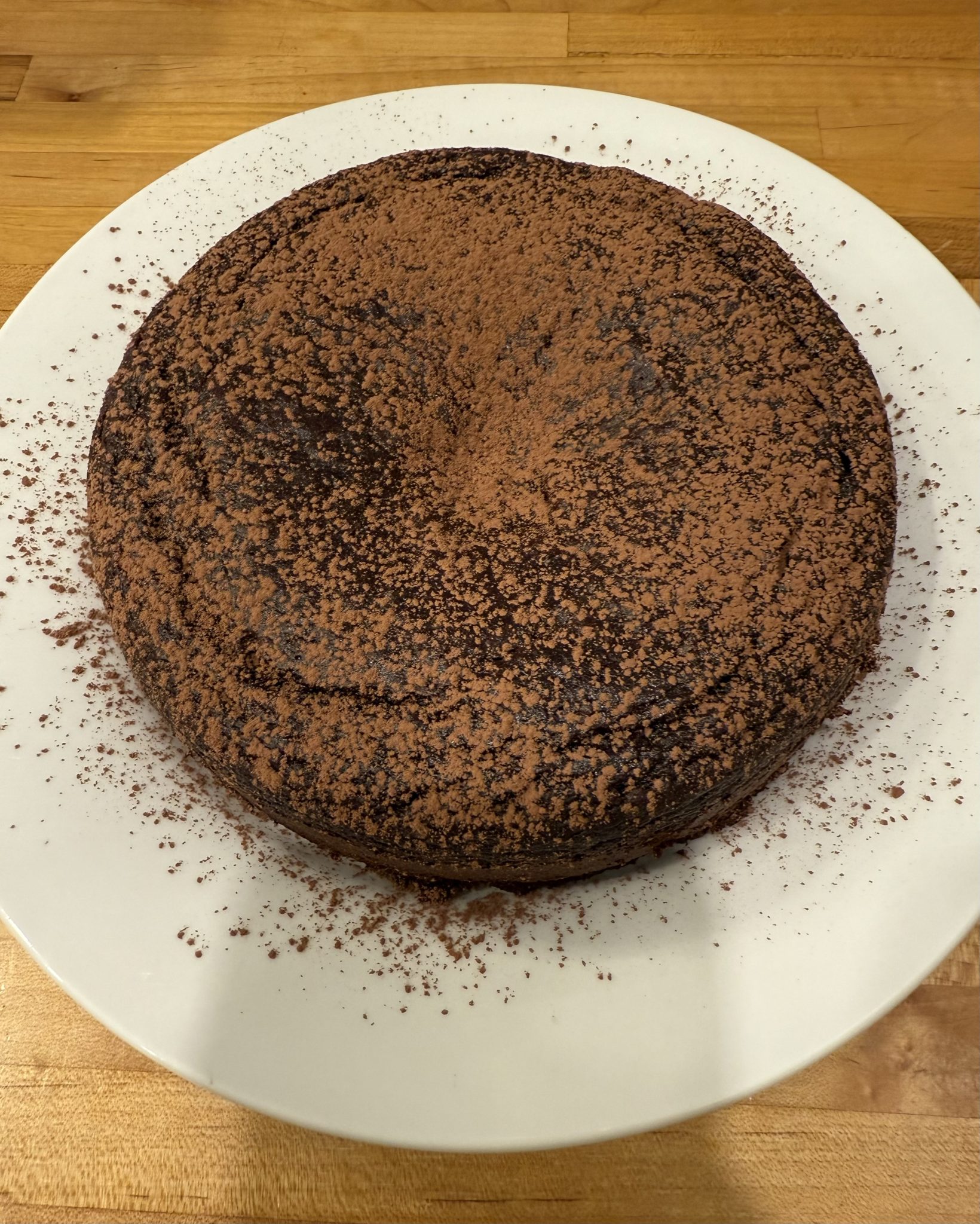Bake until the edges are set and the center is just slightly soft, then let the cake cool completely — it will sink as it cools and that’s exactly what you want. Chill before slicing for the best texture, then serve with cocoa powder, whipped cream, or fresh berries.