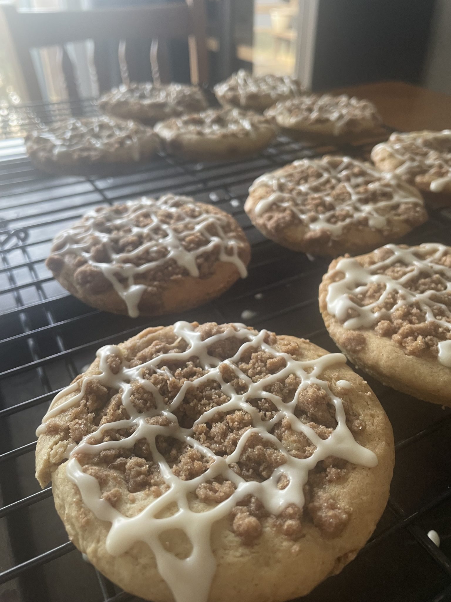 When you take a bite of these soft and chewy coffee cake cookies you will savor each bite that includes a blanket of buttery brown sugar streusel and vanilla icing. Each cookie is filled with this cinnamon-y sweet crumble and you won’t be able to stop at just one bite.
