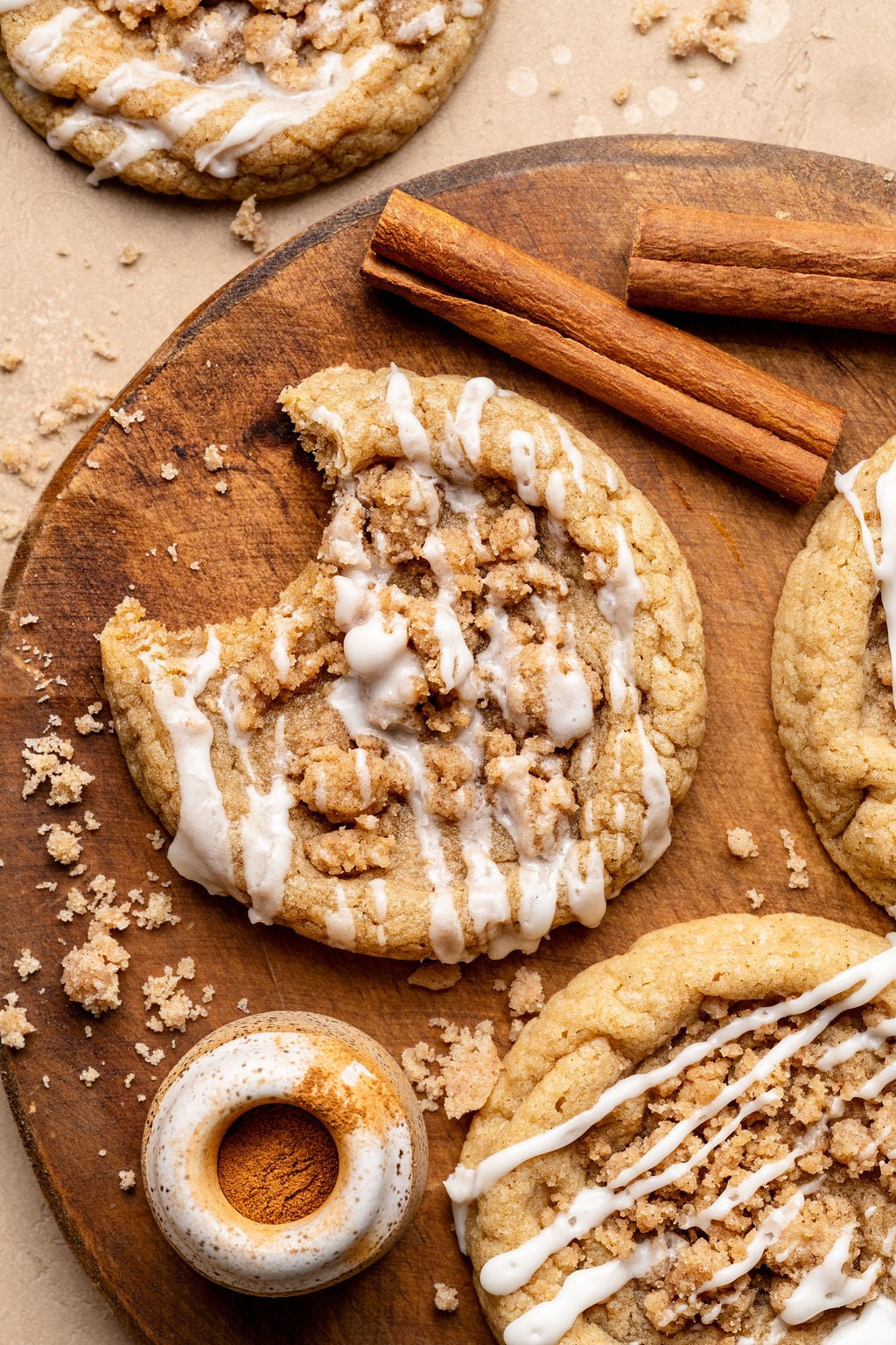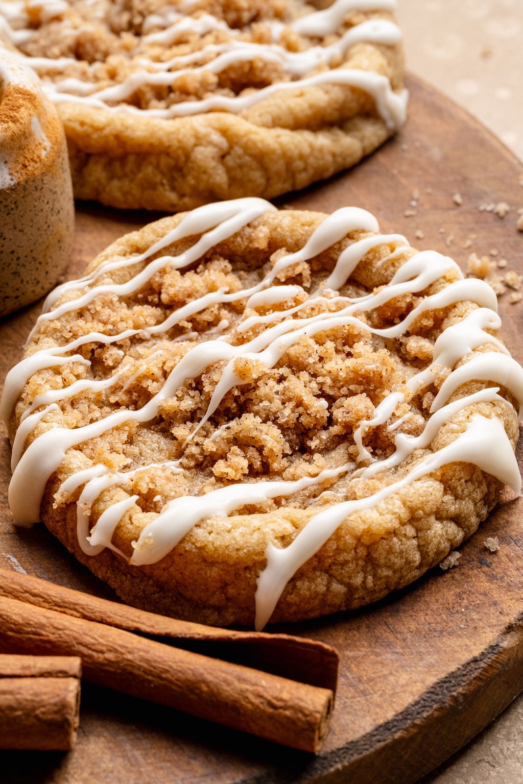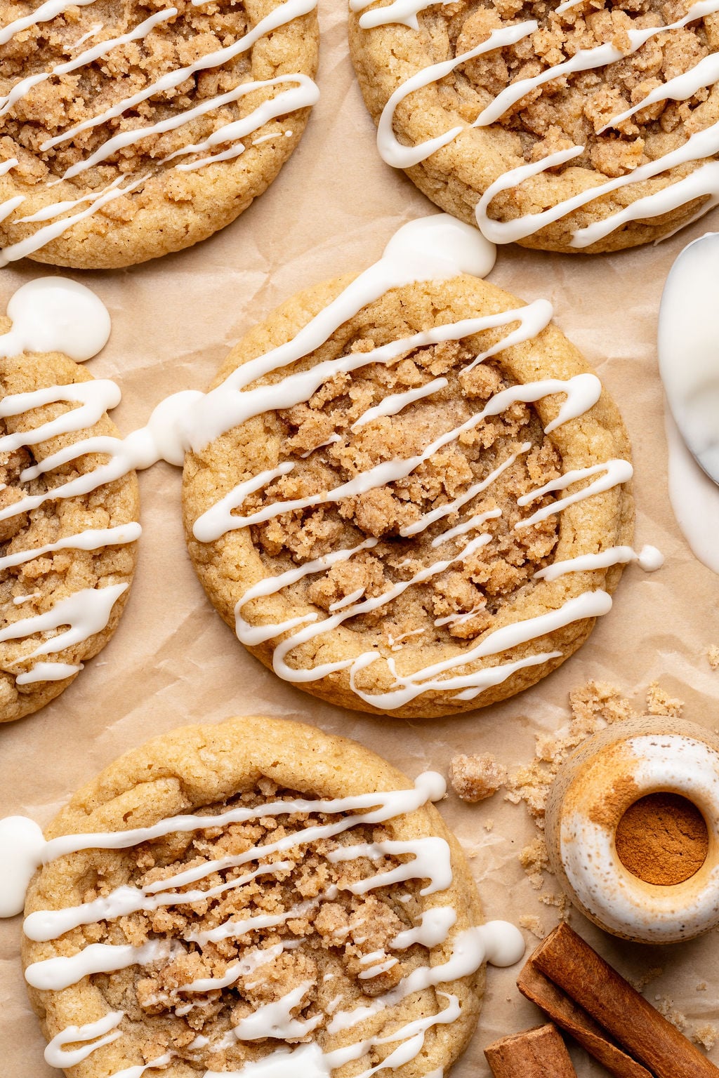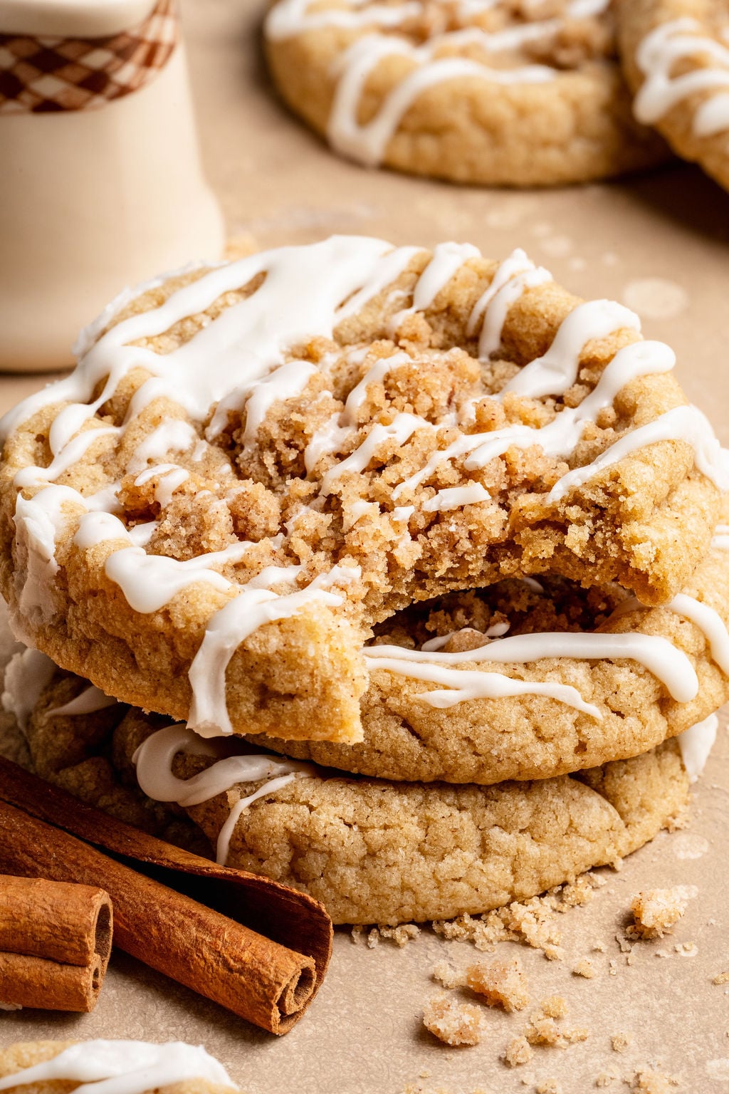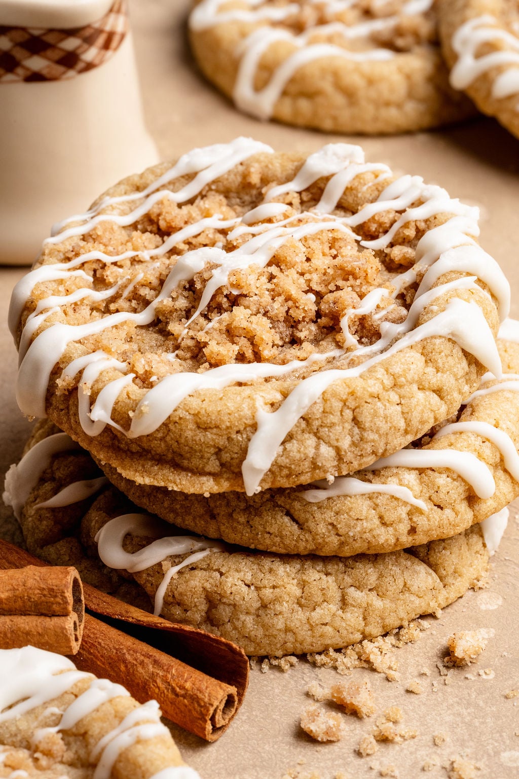 These cookies are a Kroll’s Korner classic! Originally published in 2022 and with over 400 reviews later, this recipe has become one of the most popular cookies on the internet. Often called the “Gilmore Girl Cookies” – I’ve made them with a cinnamon sugar cookie dough base, then each cookie is filled with an easy to make cinnamon brown sugar streusel… and in true coffee cake fashion finished with a powdered sugar glaze. HEAVEN IN A COOKIE! After lots of feedback in the comment section, this recipe deserved a facelift. But, if you’re a tried and true fan of the original recipe, I’ve of course kept it for you! See the recipe card for the 2022 recipe, and also the new and improved 2026 recipe. I also created a printable version of the 2022 recipe that you can download here! xo