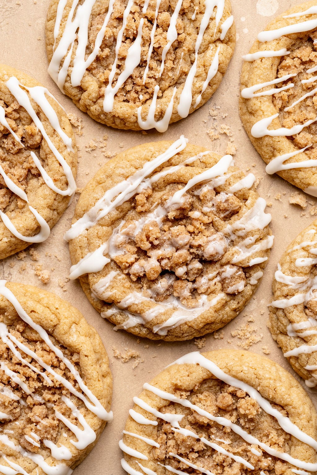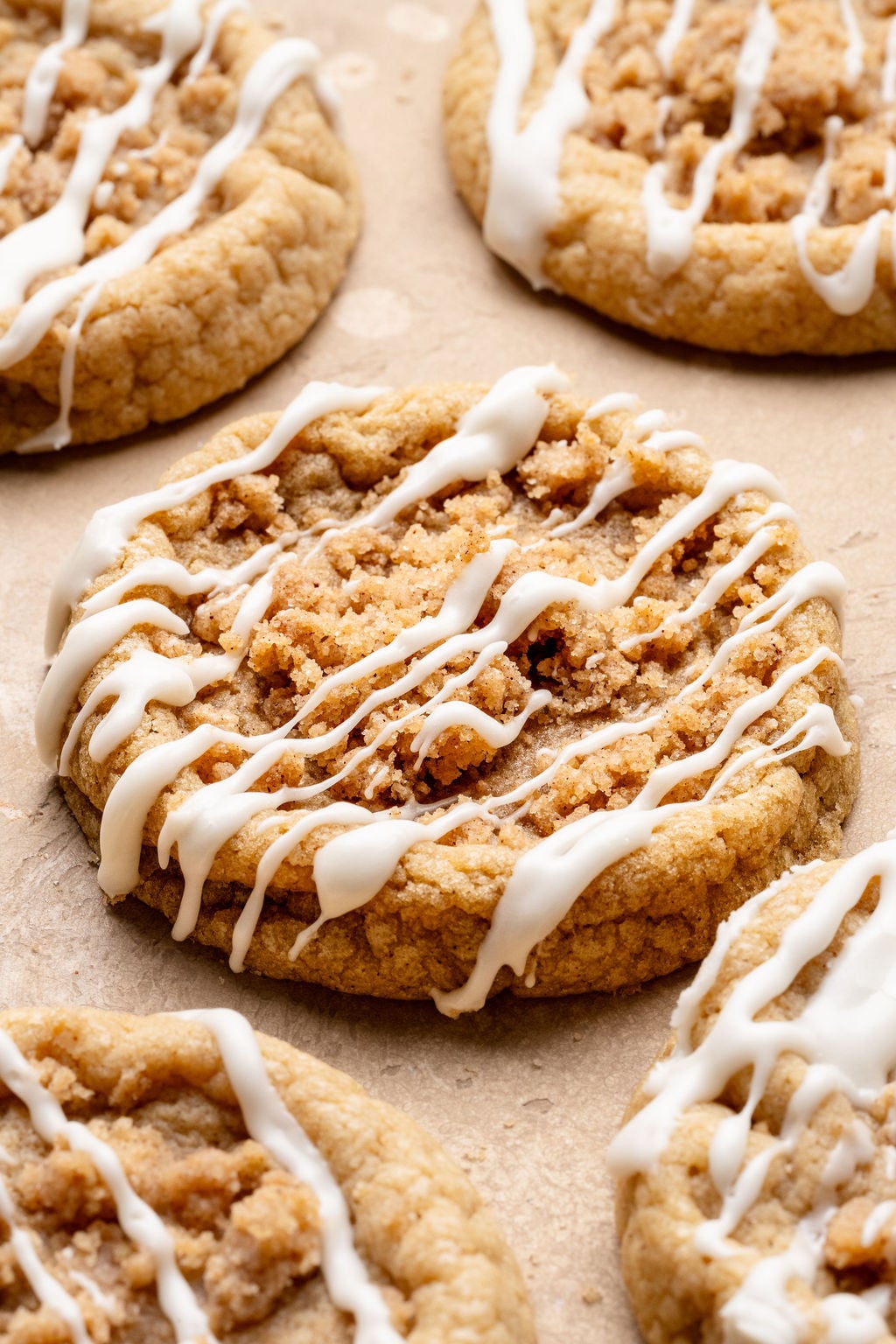 Just like a great piece of coffee cake, each bite of these Coffee Cake Cookies is topped with a buttery-sweet cinnamon crumble that is crunchy on top and soft on the bottom. And you can’t forget the icing! Oh my gosh the icing is SO GOOD. I feel like they are naked without it! The creamy, buttery, vanilla icing tucks itself around each morsel of the streusel crumble in all of the best ways.