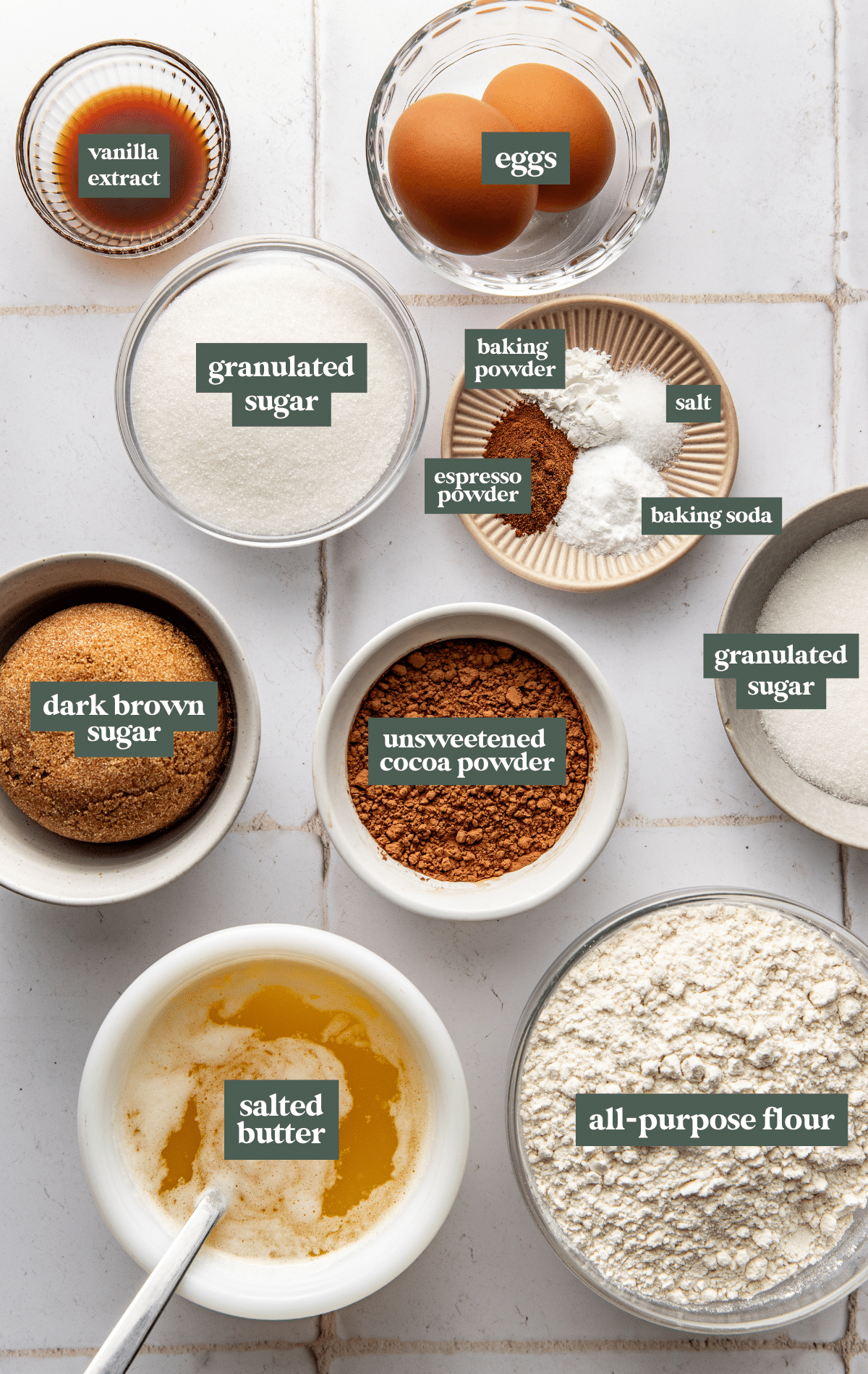 - Combine dry ingredients: In a separate bowl, whisk together the flour, cocoa powder, espresso powder, baking soda, baking powder, and salt.2¼ cups all-purpose flour, 1/2 cup unsweetened cocoa powder, 1 tsp. espresso powder, 1 tsp. baking soda, 3/4 tsp. baking powder, 1/2 tsp. fine salt