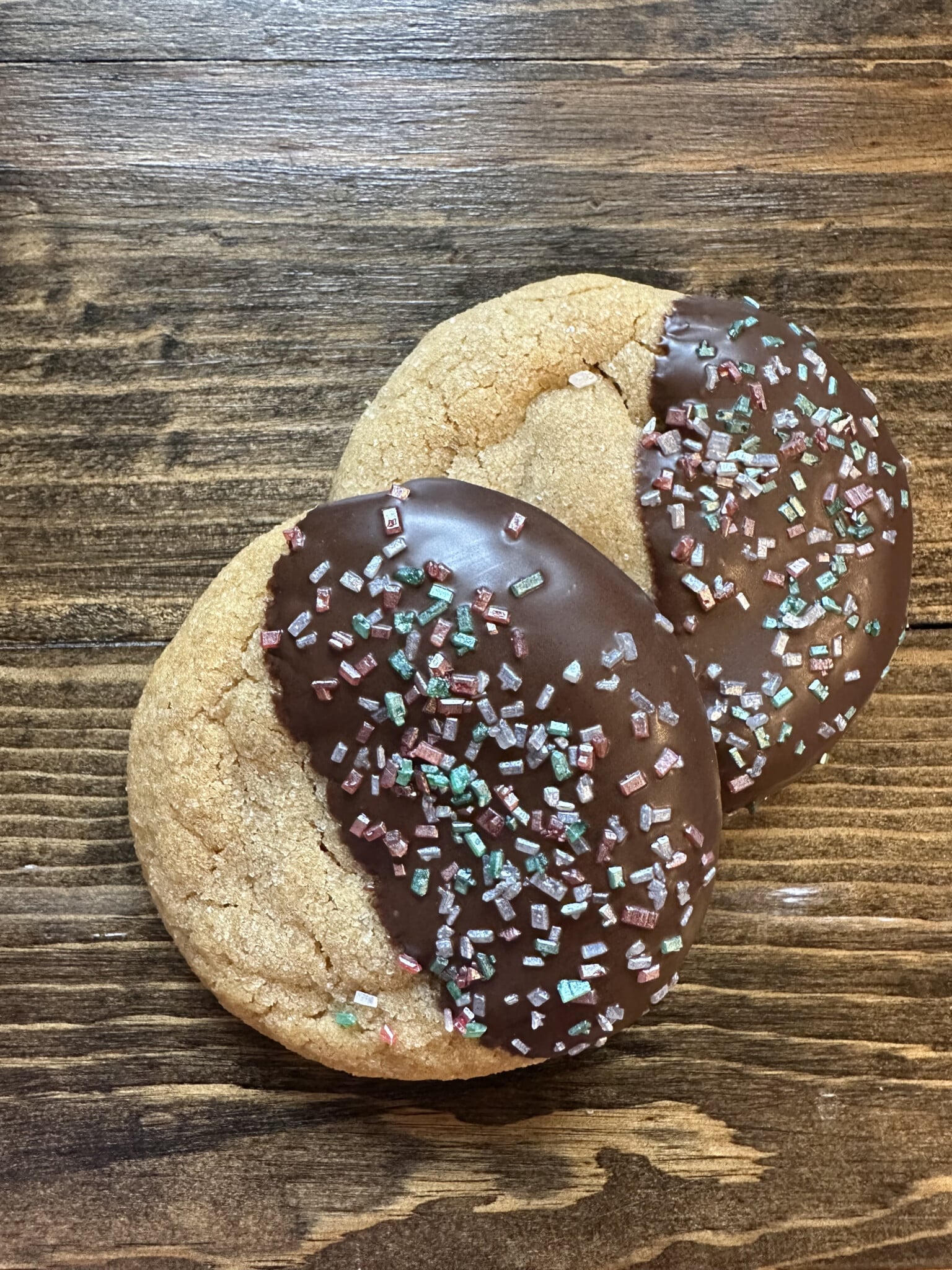 - Cool, then dip in melted dark chocolate and finish with holiday sprinkles.
