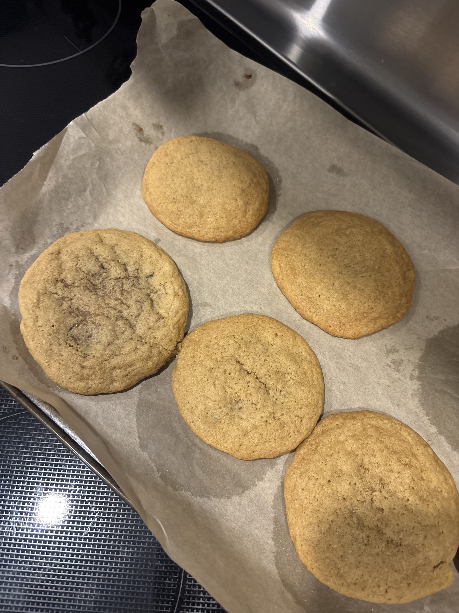 six cookies on a baking sheet