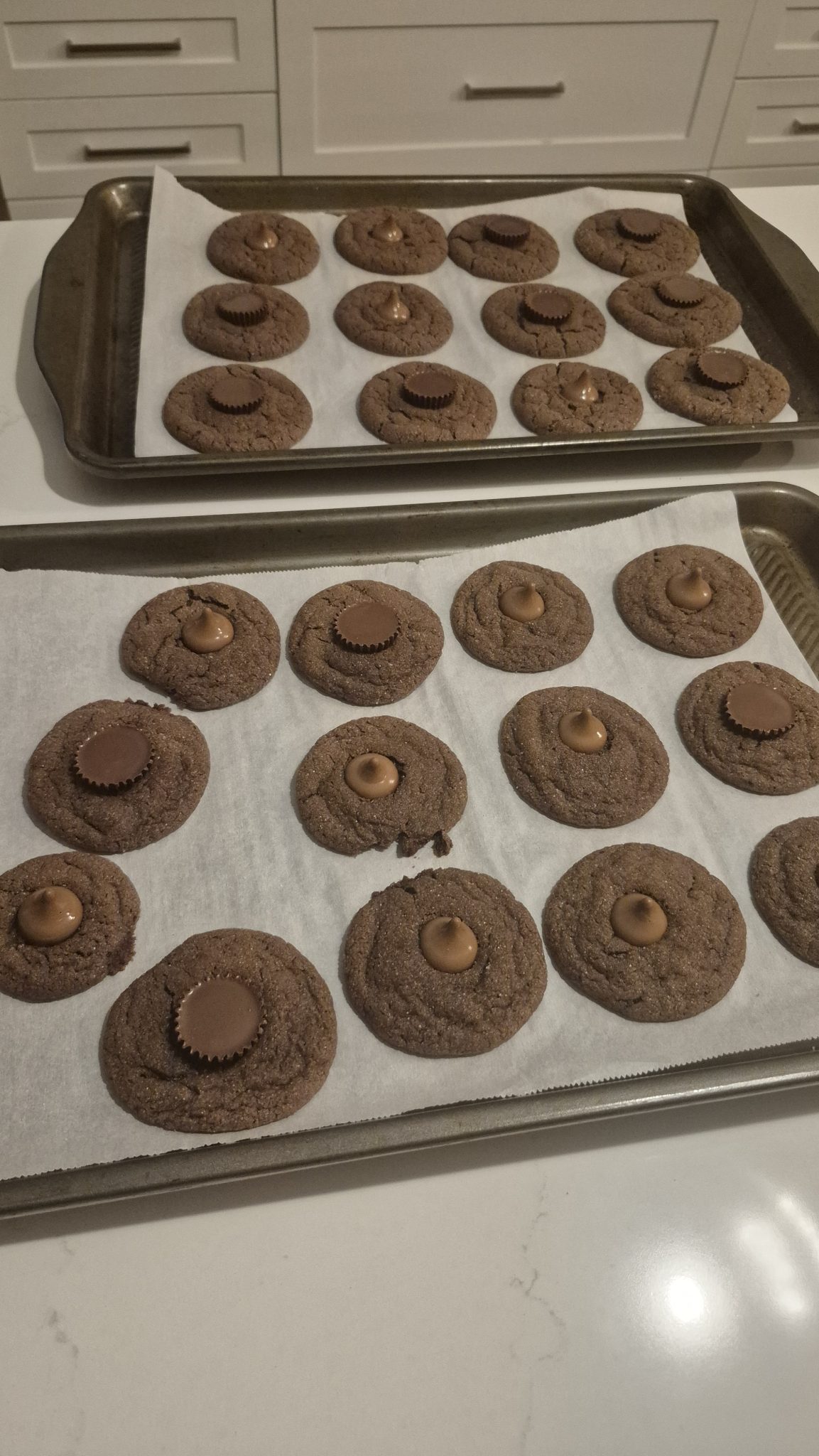 - Add chocolate: Immediately press a Hershey’s Kiss into the center of each cookie, and you’ll see those classic crinkles form. Allow cookies to cool on the baking sheet for 5-8 minutes before transferring to a wire rack to cool completely and garnish the cookies with any reserved granulated sugar, if desired. The cookies are soft and brownie-like – and SO good frozen too!20 Hershey’s Kisses, mini peanut butter cups, or Rolo’s