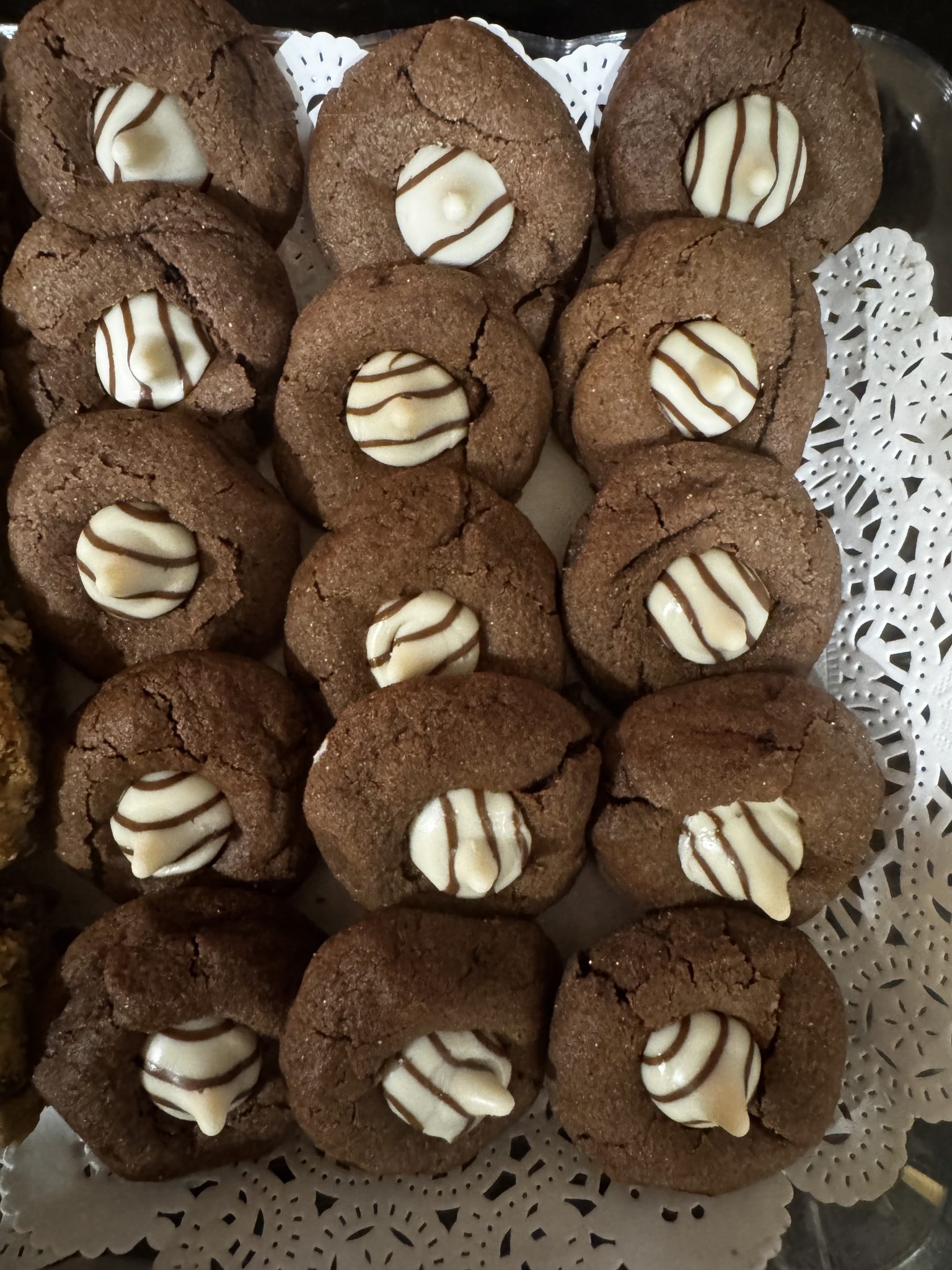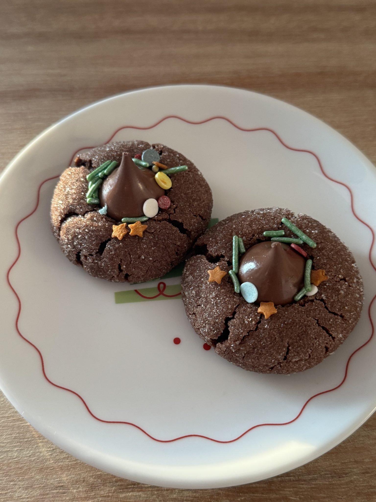 Bake for 8–10 minutes. Immediately upon removing the cookies from the oven, press a Hershey’s Kiss into the center of each cookie, and you’ll see those classic crinkles form. Allow cookies to cool completely and enjoy!