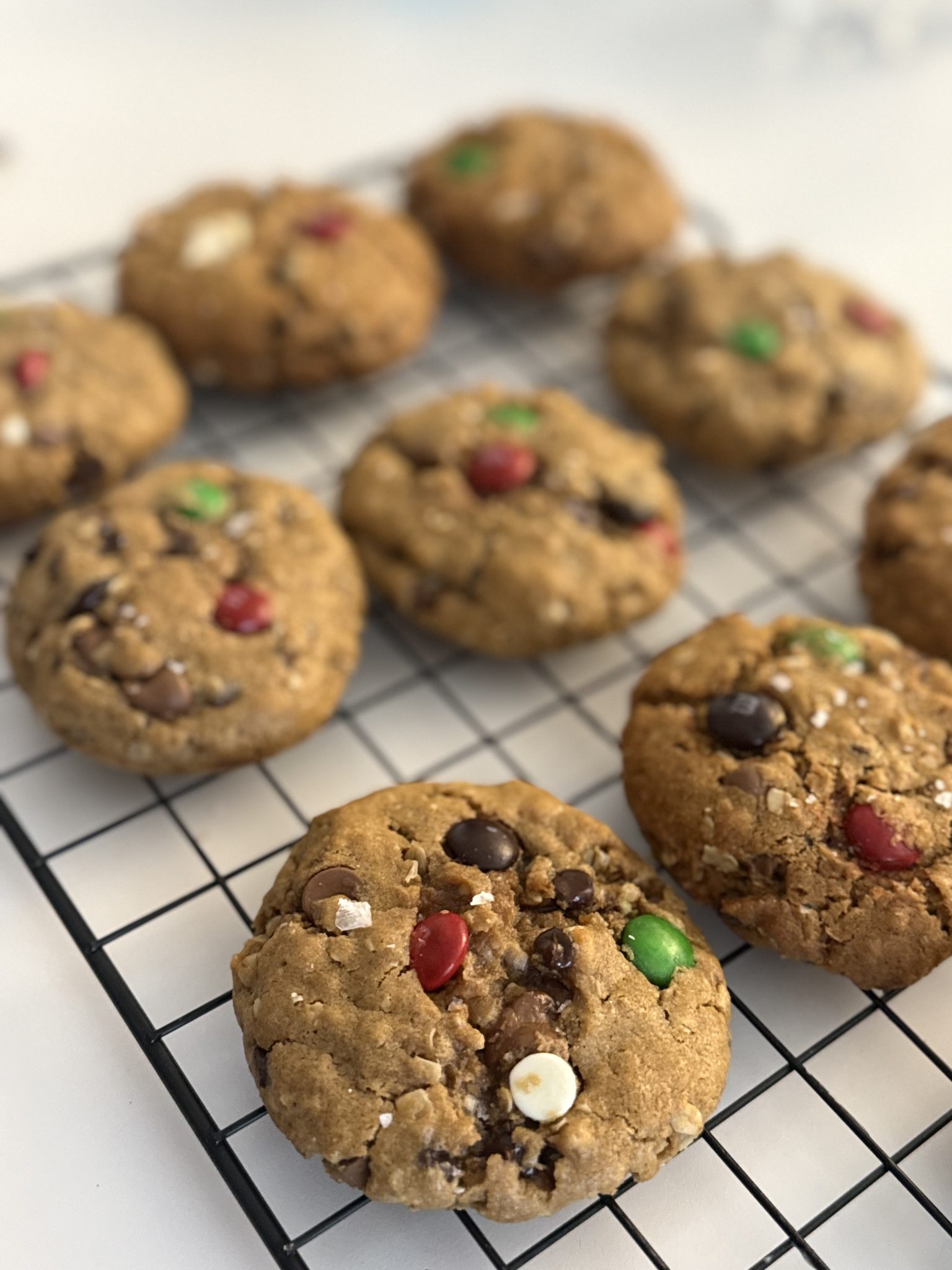 These cookies are packed with oats, peanut butter, red and green M&Ms, and mini chocolate chips and are more on the thin and chewy side, as opposed to big and thick.