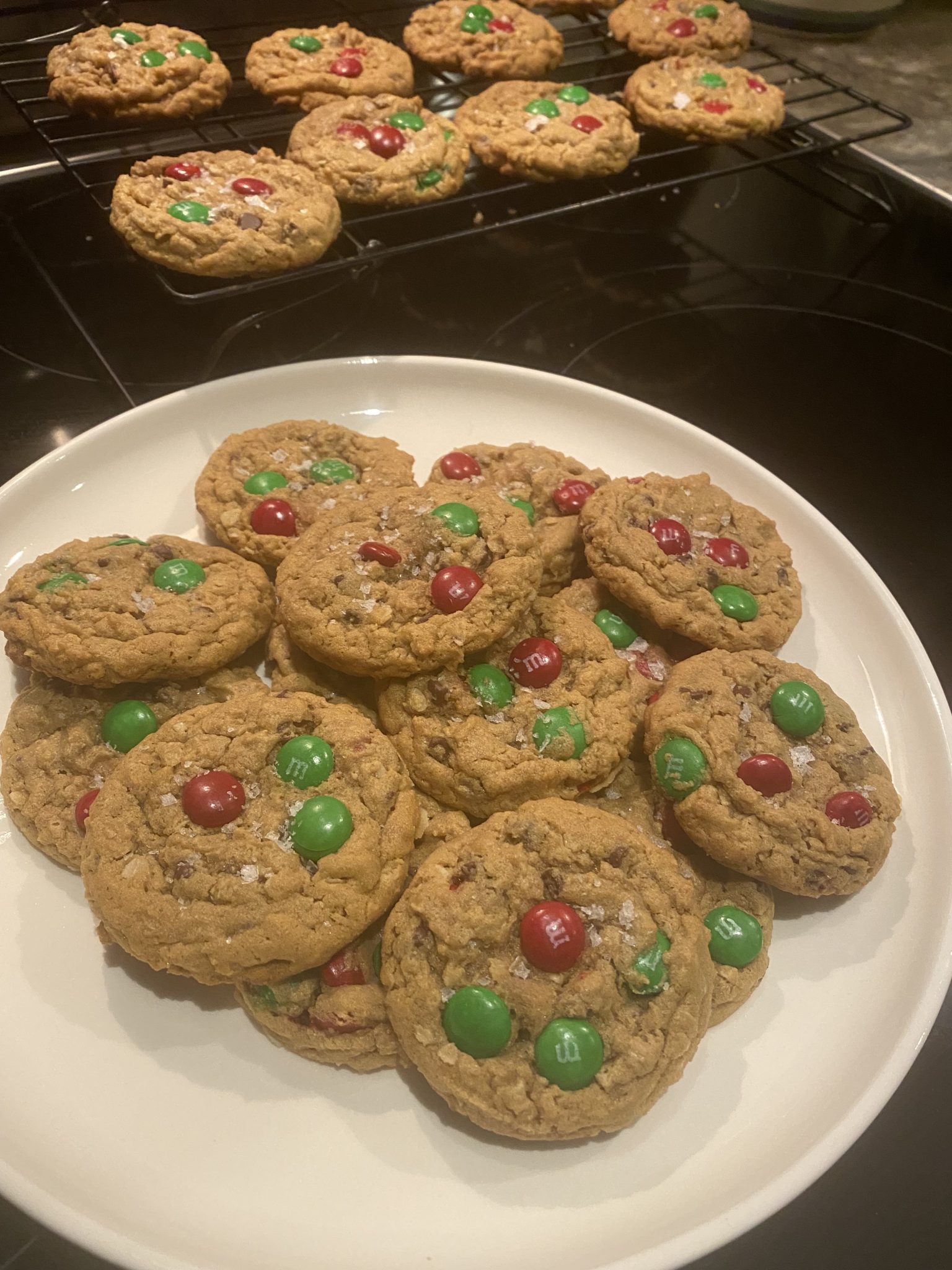 - These thin and chewy, chunky cookies are studded with red and green M&Ms, embodying the cheerful spirit of Christmas and capture the indulgence of the holidays in every bite.