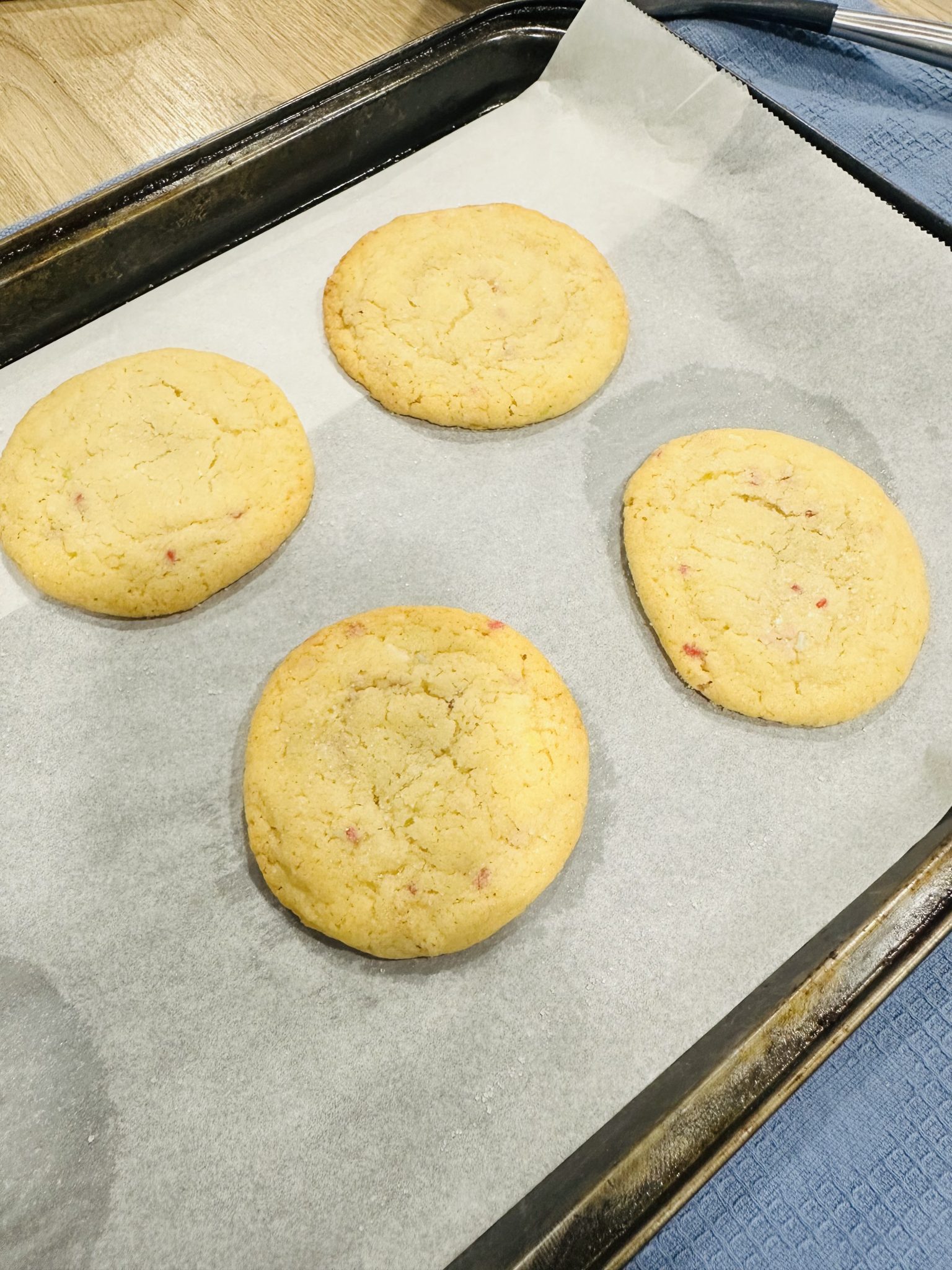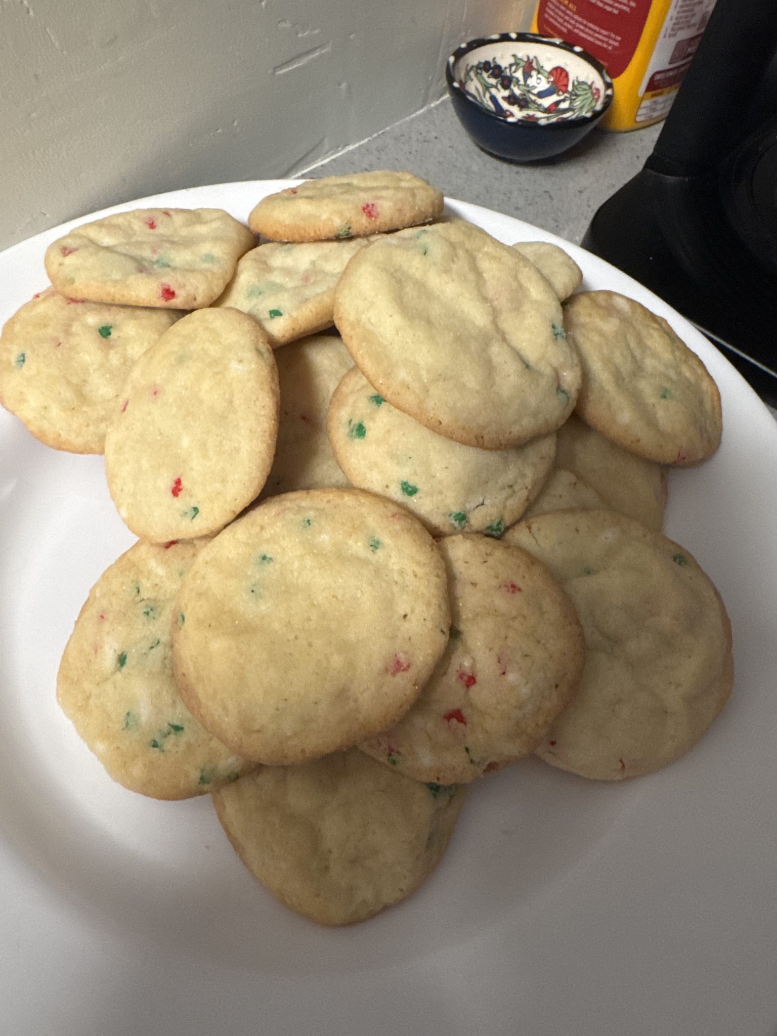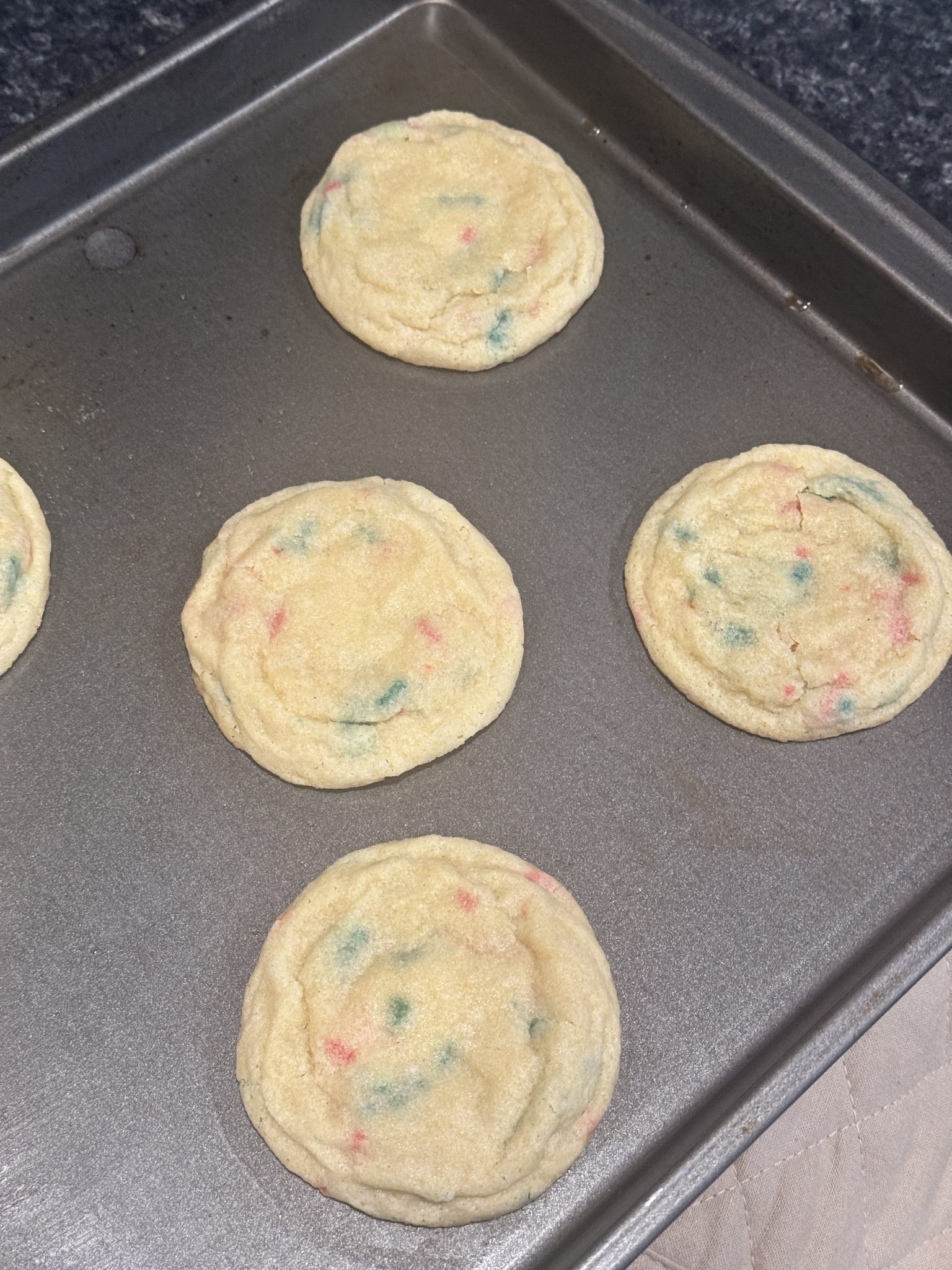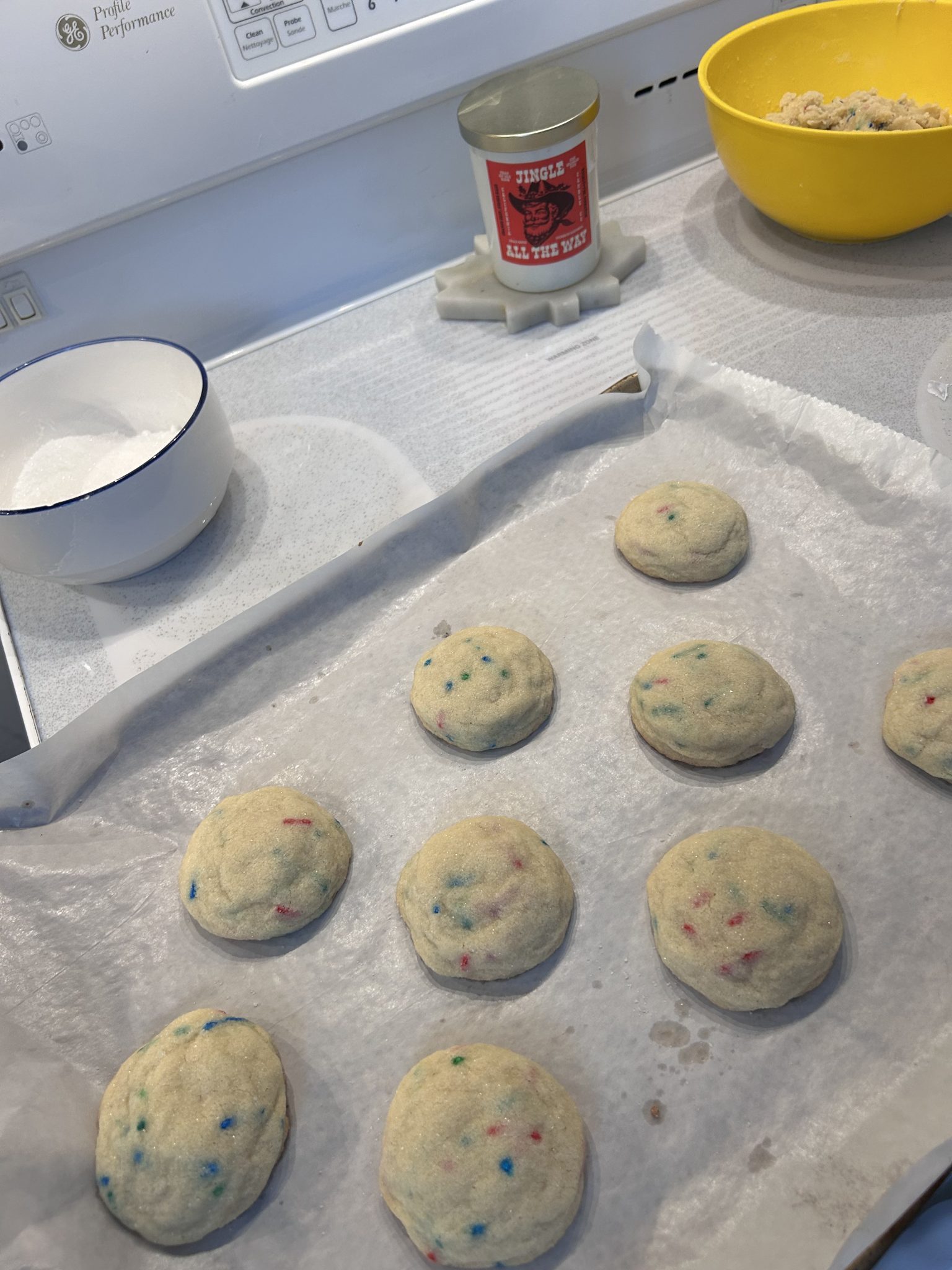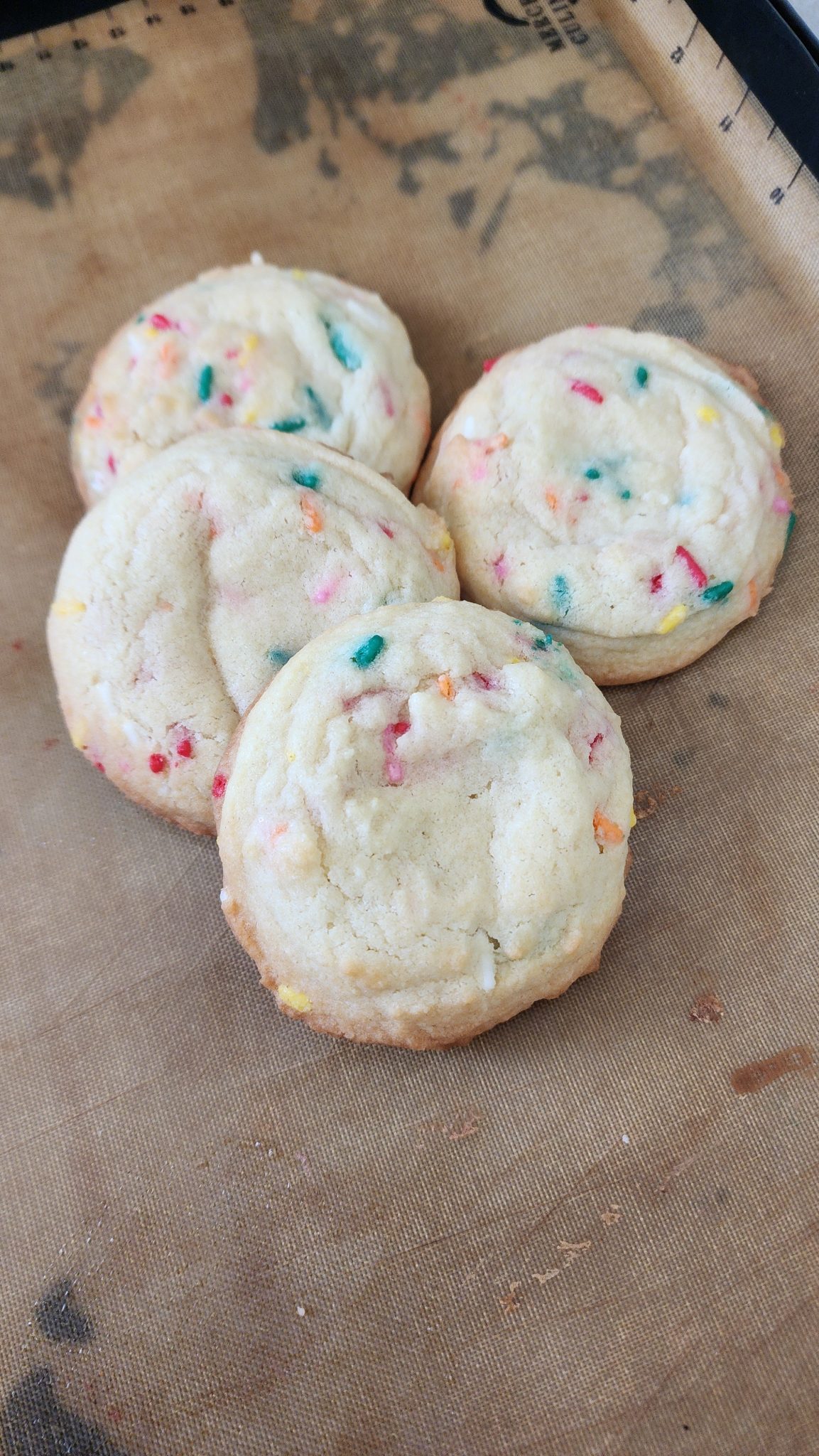 Bake at 350°F for 8–10 minutes, until edges are set and centers are slightly soft. Cool on the baking sheet for a few minutes, then transfer to a wire rack. Garnish with extra sprinkles or a dusting of sugar for a festive finish!