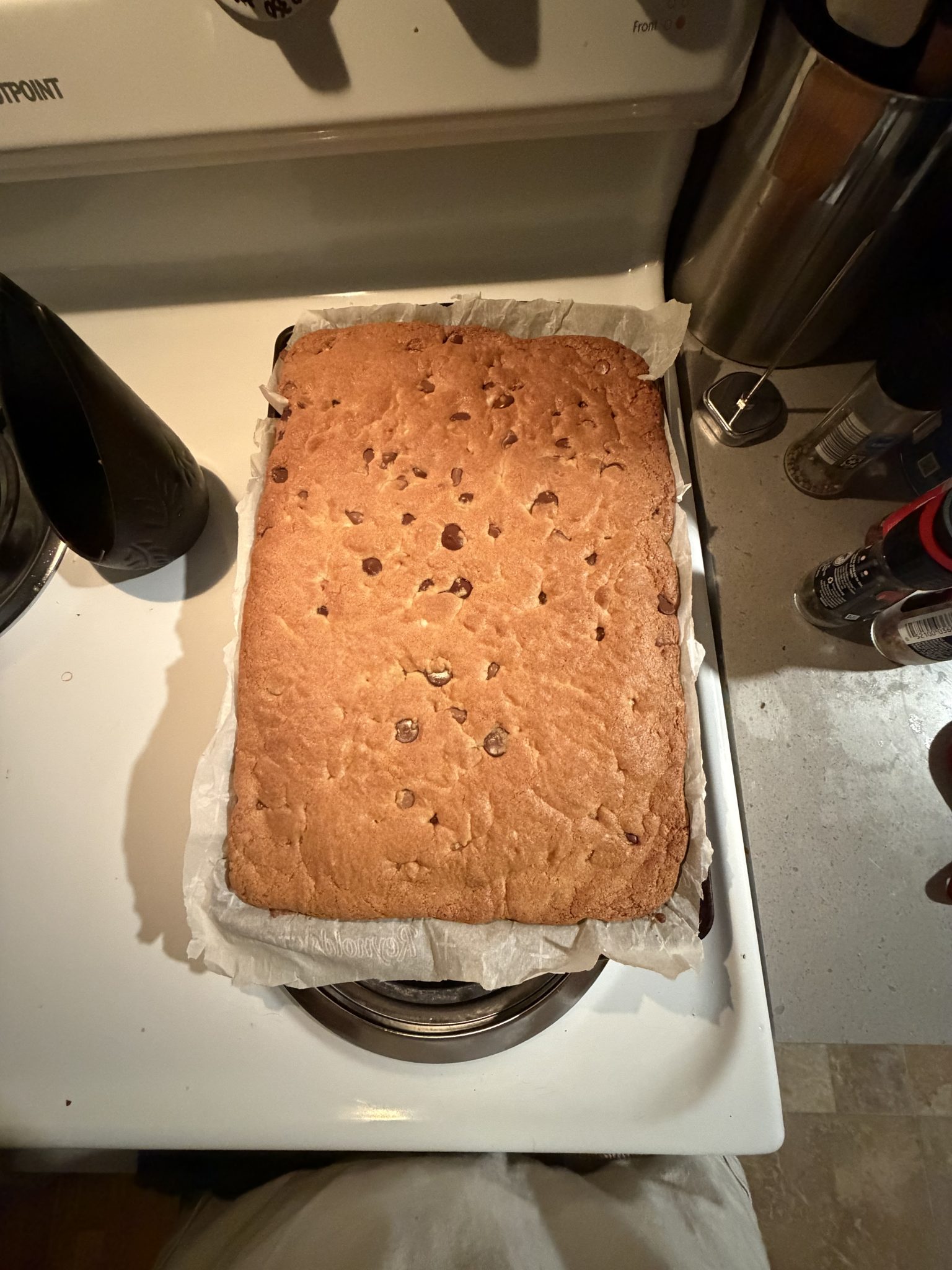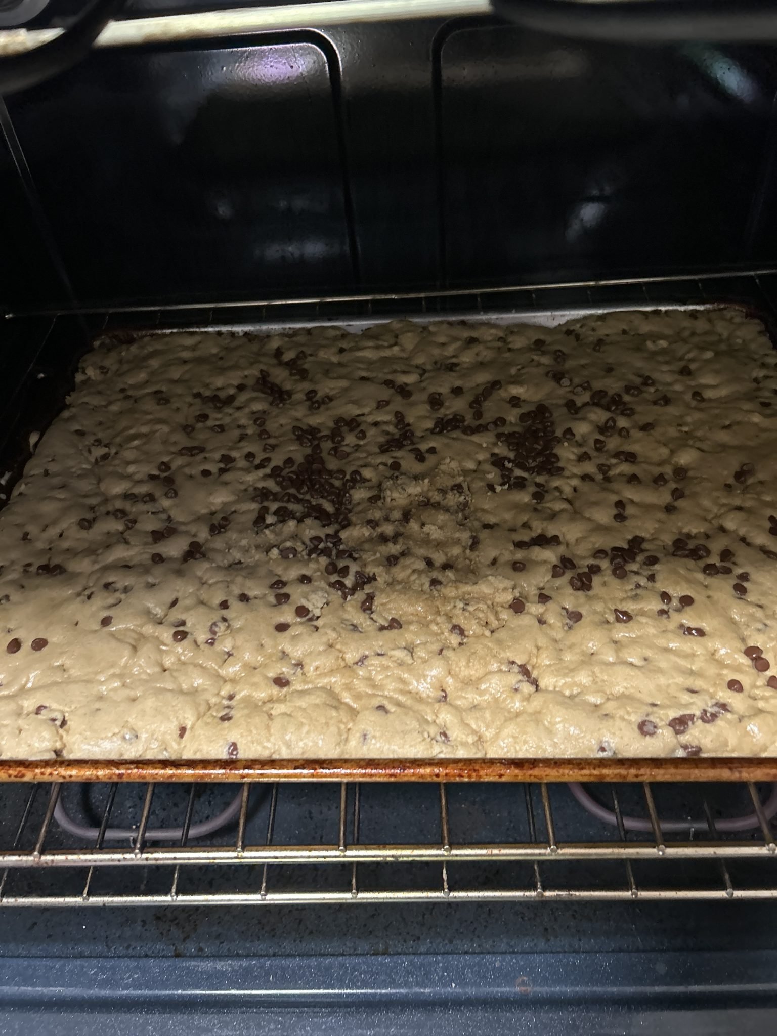- Spread evenly until smooth. Trust the process, it will all spread out and fit on the pan 🤗 Top with more chocolate chips if desired, or you can sprinkle a few on top AFTER it bakes so they get melty on the tops post baking.