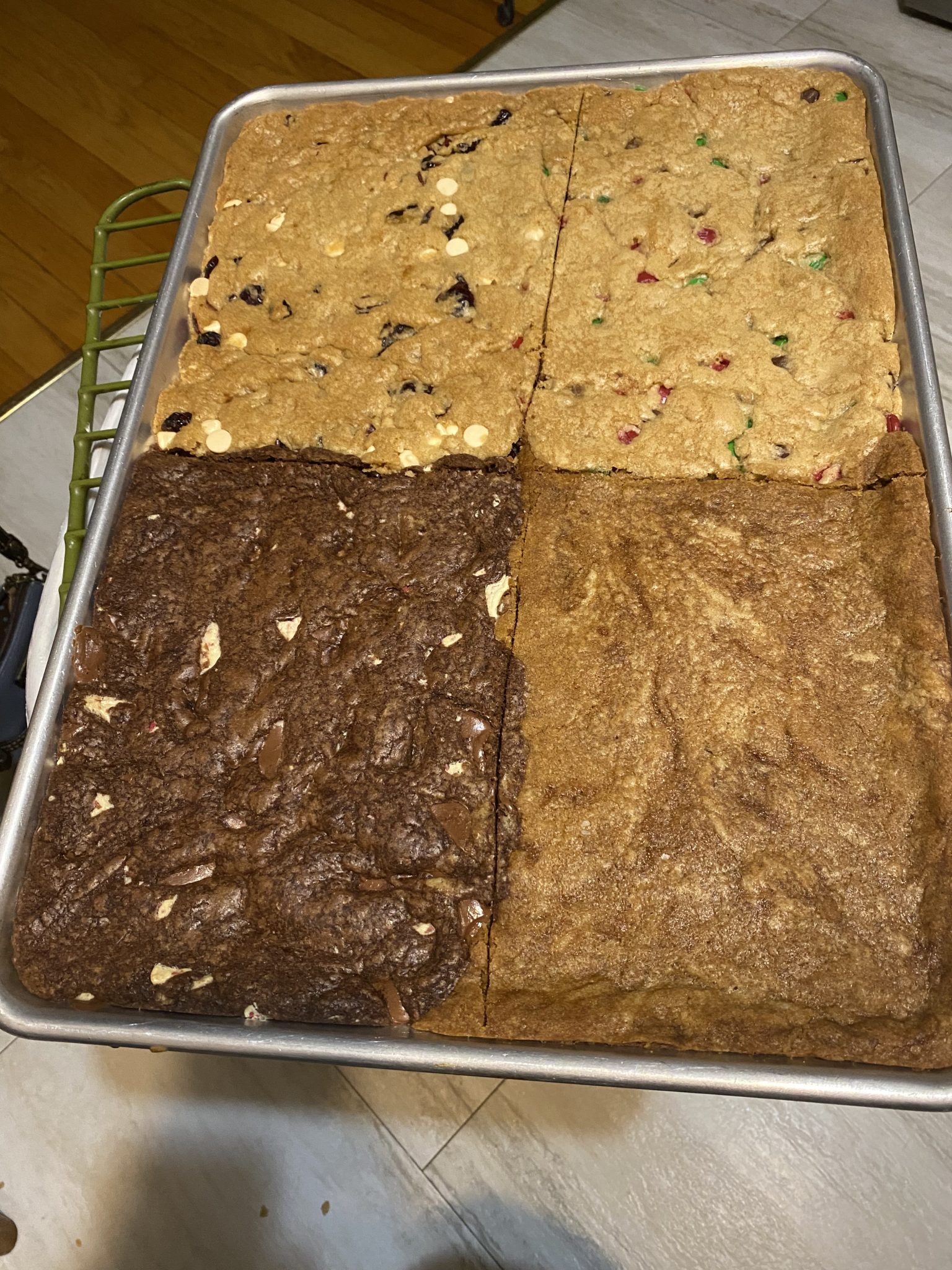 - Divide the base cookie dough batter into 4 equal sections and place in 4 medium sized bowls. You can use a food scale to weigh each portion of so they are more accurate if you'd like, each quadrant will be ~10-11 oz. each.