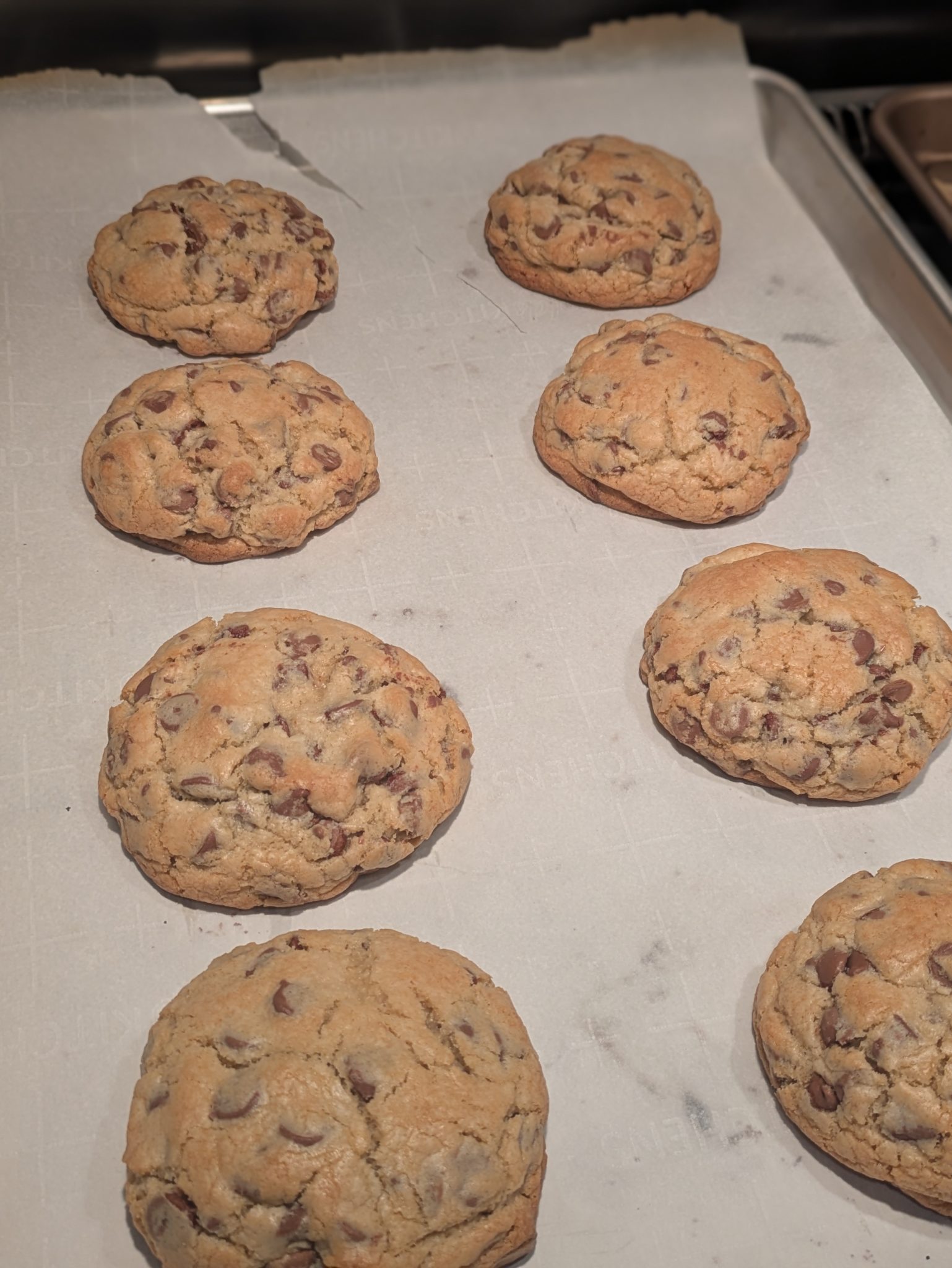 - Measure out ~6, 5.7 oz. cookies. I like to use a food scale for this but if you don't have one, simply eye-ball it. Cookies will be a little smaller than a fist, huge I know! Keep the cookies nice and tall and don't flatten them. Place cookies on a cookie sheet. You can use a silicone baking mat or parchment paper if you prefer.