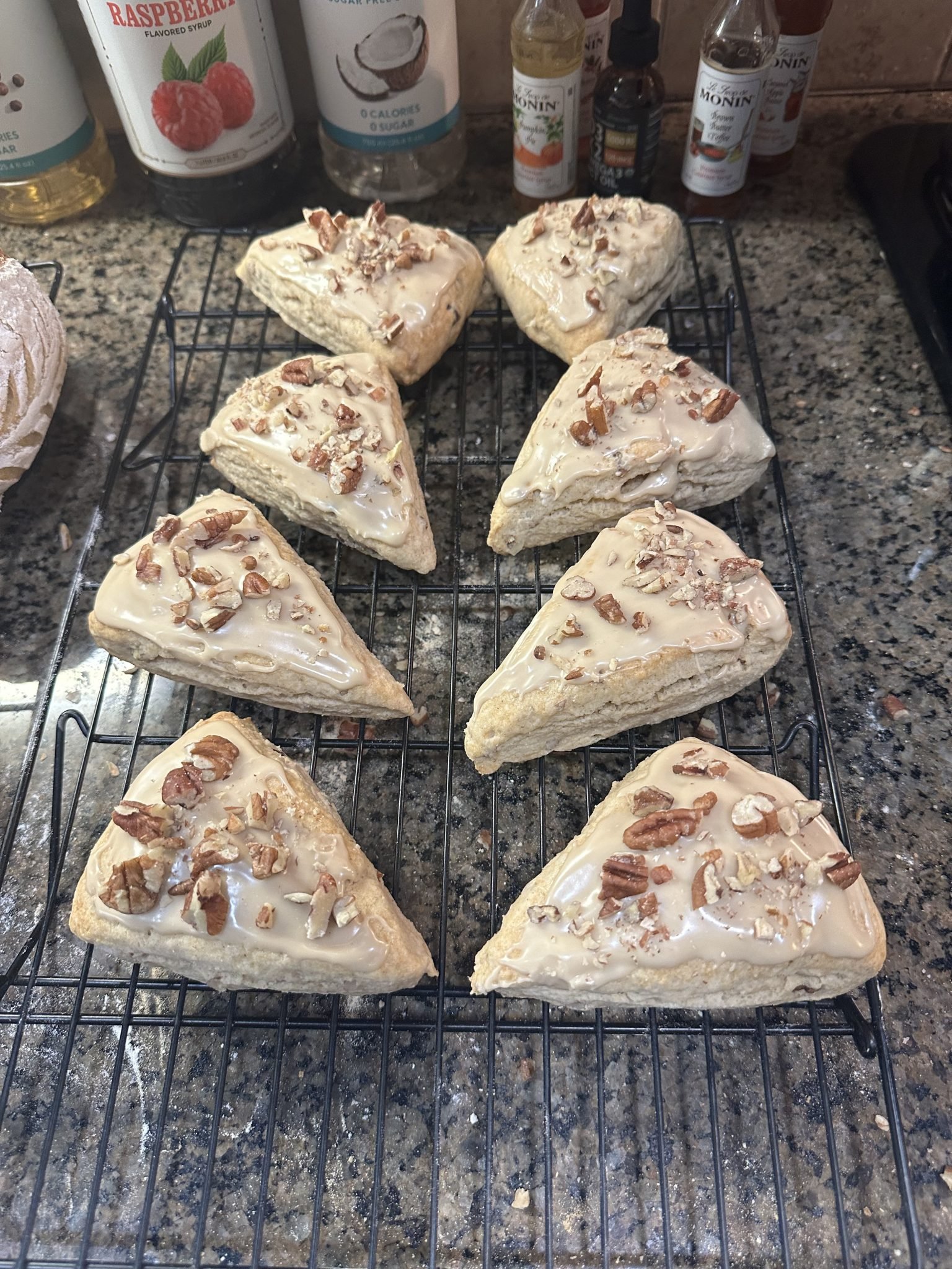 Spread glaze on top of cooled scones. Garnish with pecan pieces. Enjoy!