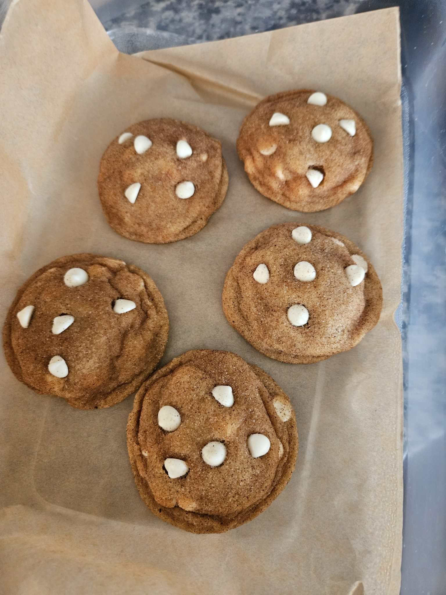 - White chocolate chips: I really like the sweetness of the white chocolate chips in these cookies (plus, I think they look so pretty😍), but you could also substitute them for semi-sweet chocolate chips or just omit them completely for a more traditional snickerdoodle taste.