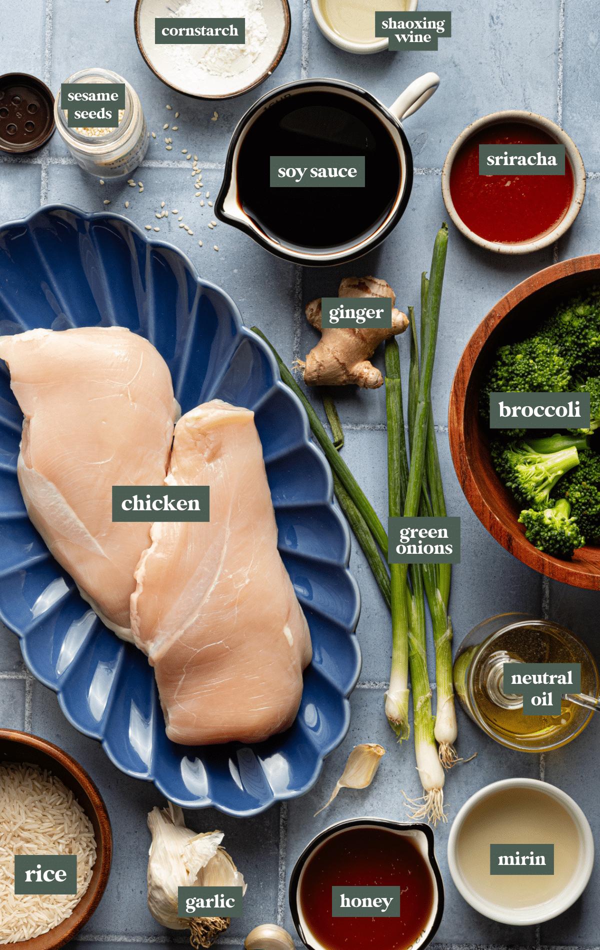 - Make the sauce: While the chicken cooks, whisk together soy sauce, honey, Shaoxing wine, sriracha, mirin, garlic, and ginger in a bowl or I like to use a measuring cup.1 cup soy sauce, 1/2 cup honey, 1 Tbsp. Shaoxing wine, 1-2 Tbsp. sriracha, 1 Tbsp. mirin, 2 tsp. garlic, 1 tsp. ginger
