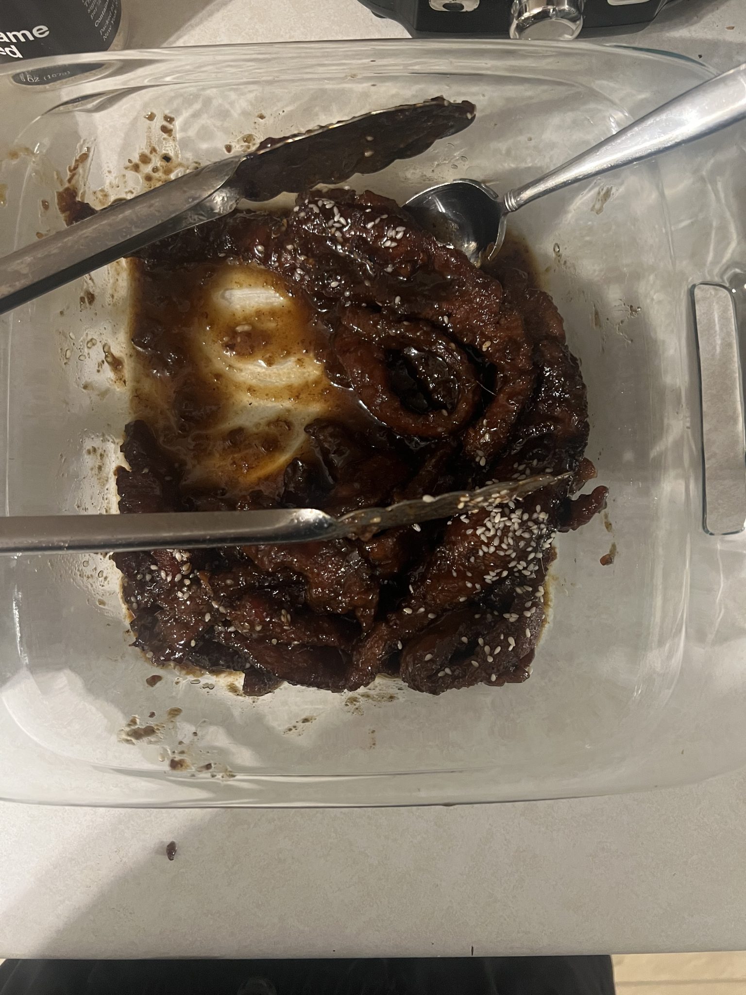 - 1 ½ lb. flank steak (cut in 1/4 inch strips against the grain)