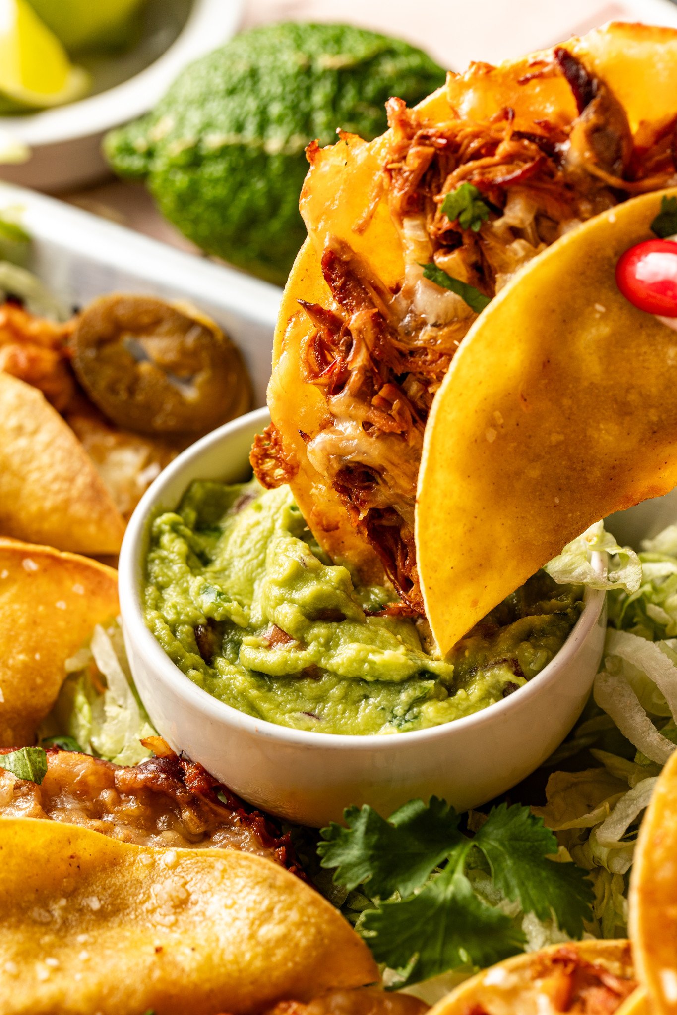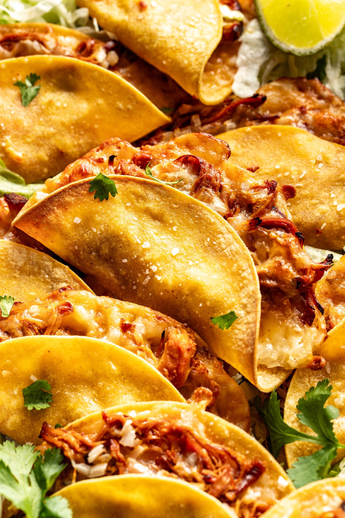 • Use saucy chicken: One of the reasons I love using my Honey Chipotle Chicken recipe is that the moisture from the sauce helps to flavor the entire taco and keeps the inside tender as it crisps.