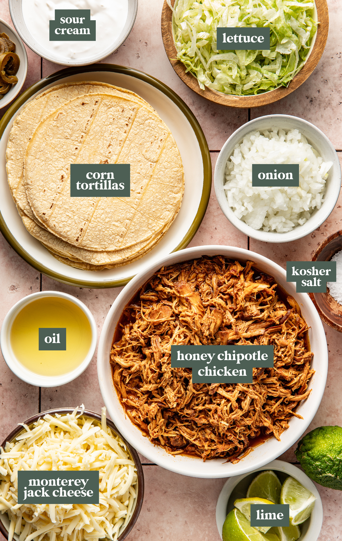 One of the reasons I love using my Honey Chipotle Chicken in this recipe is that the moisture from the saucy chicken helps to flavor the entire taco and keeps the inside tender as it crisps. It’s also why you don’t need to add a ton of other ingredients. Just toss some chicken, cheese, and onion in there, and you’re good to go!