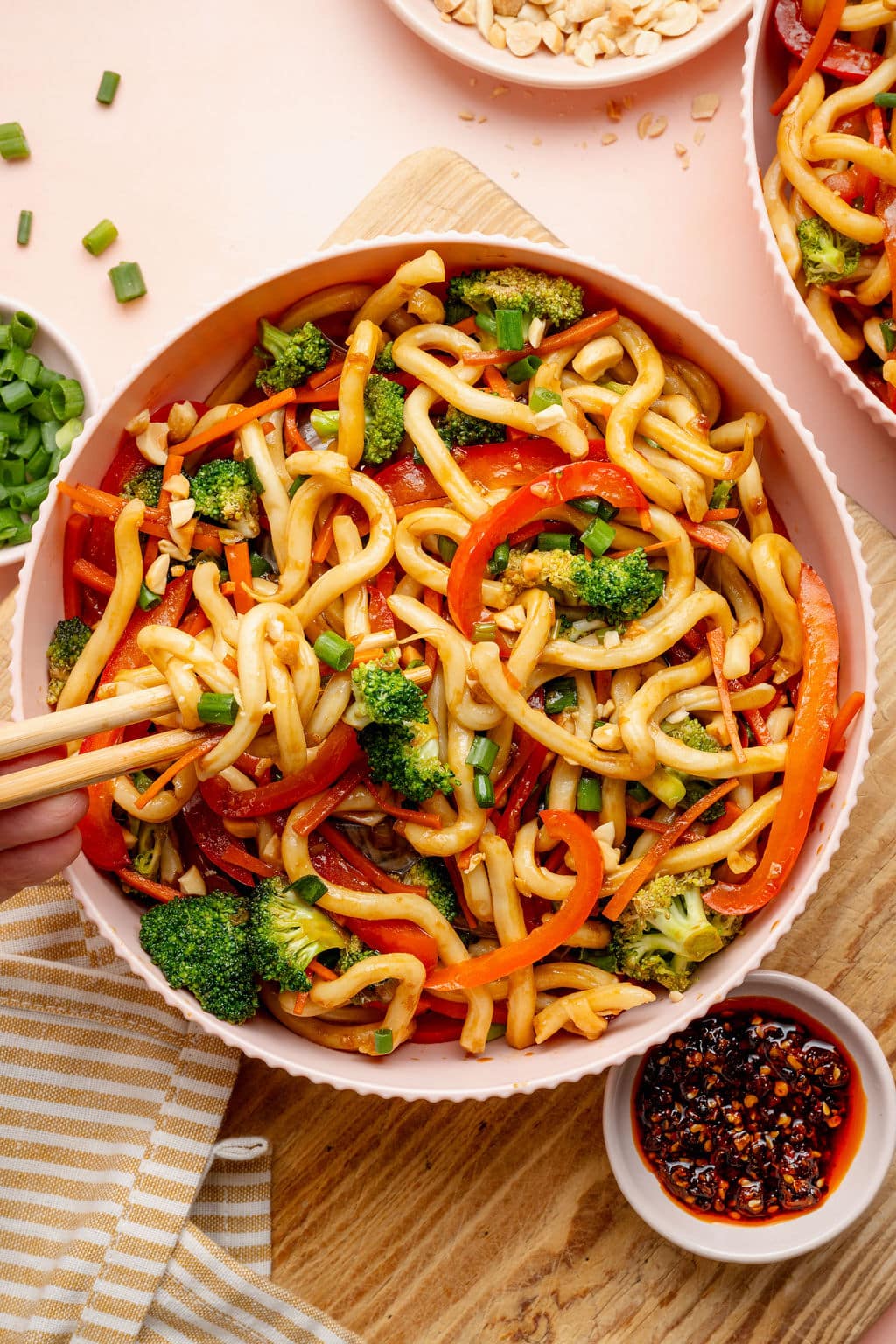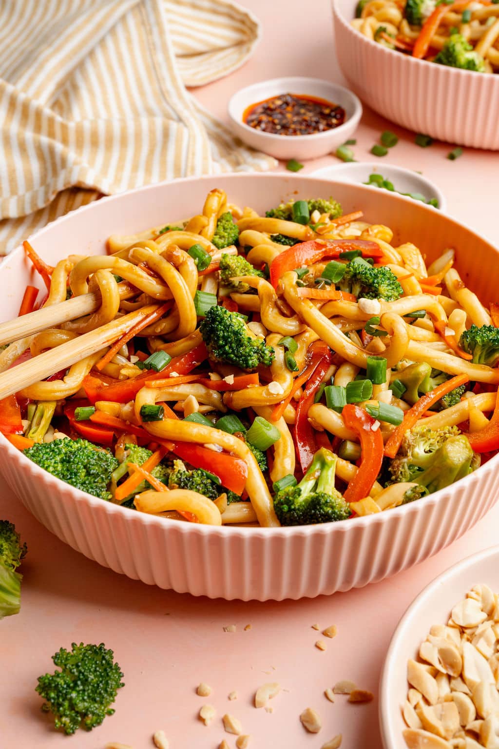 - Add the broccoli into the pan. Gently toss together the cooked udon noodles with the veggies and pour the sauce on top and mix. (Pour ~1/2 cup of the sauce first, then taste and add more as desired).