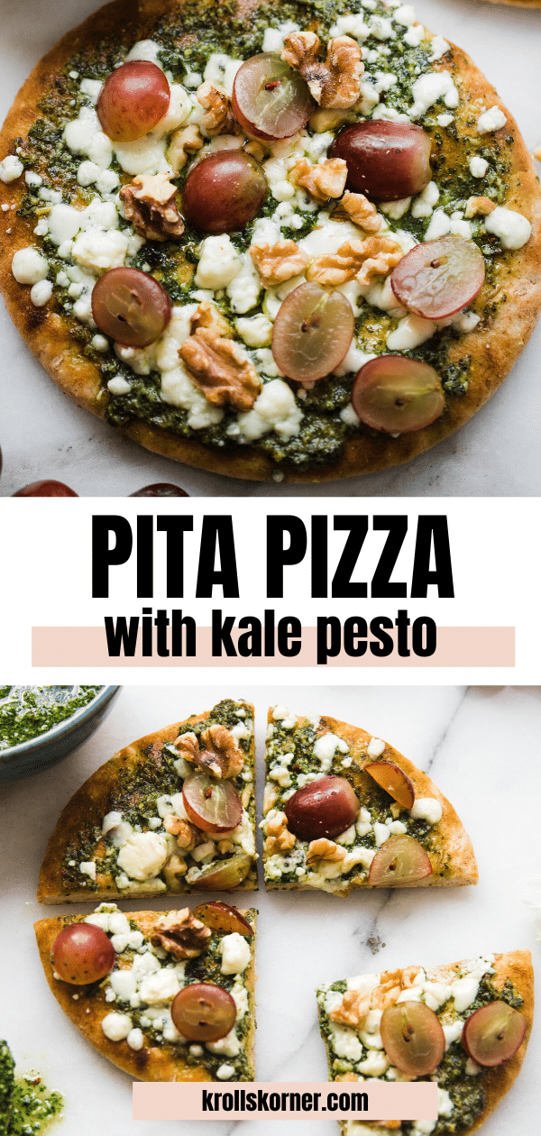 - To make the pita pizzas: Preheat oven to 350 degrees F. Place pita on baking sheet and spread with the kale pesto. Top with the grapes, cheese, and walnuts. Bake 8-10 minutes, cool slightly, drizzle with honey and cut the pizza into 4 pieces. Serve immediately.