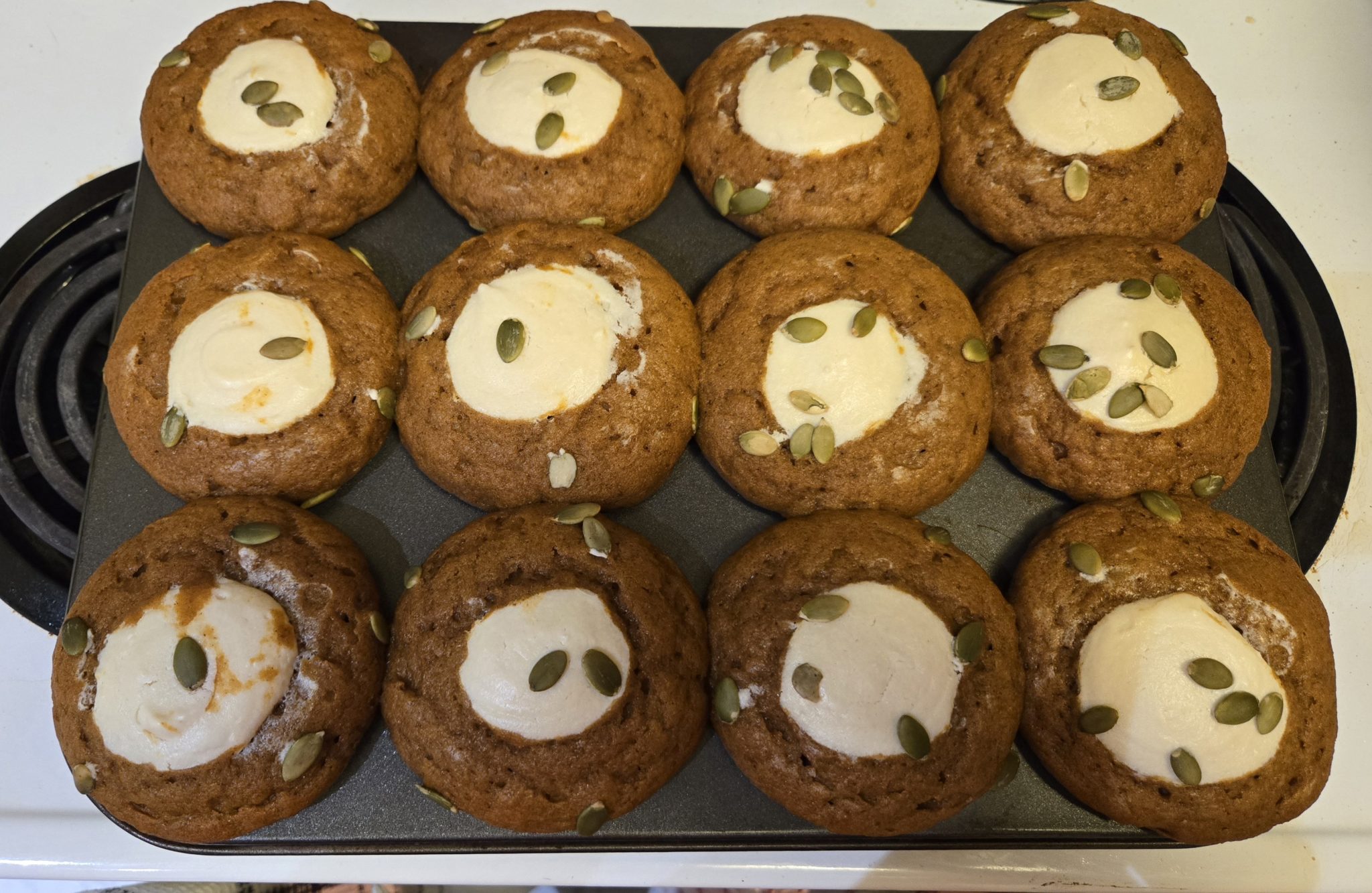 Scoop muffin batter into prepared muffin tin. Squeeze some of the cream cheese filling in the center of each muffin and decorate the sides with pumpkin seeds.