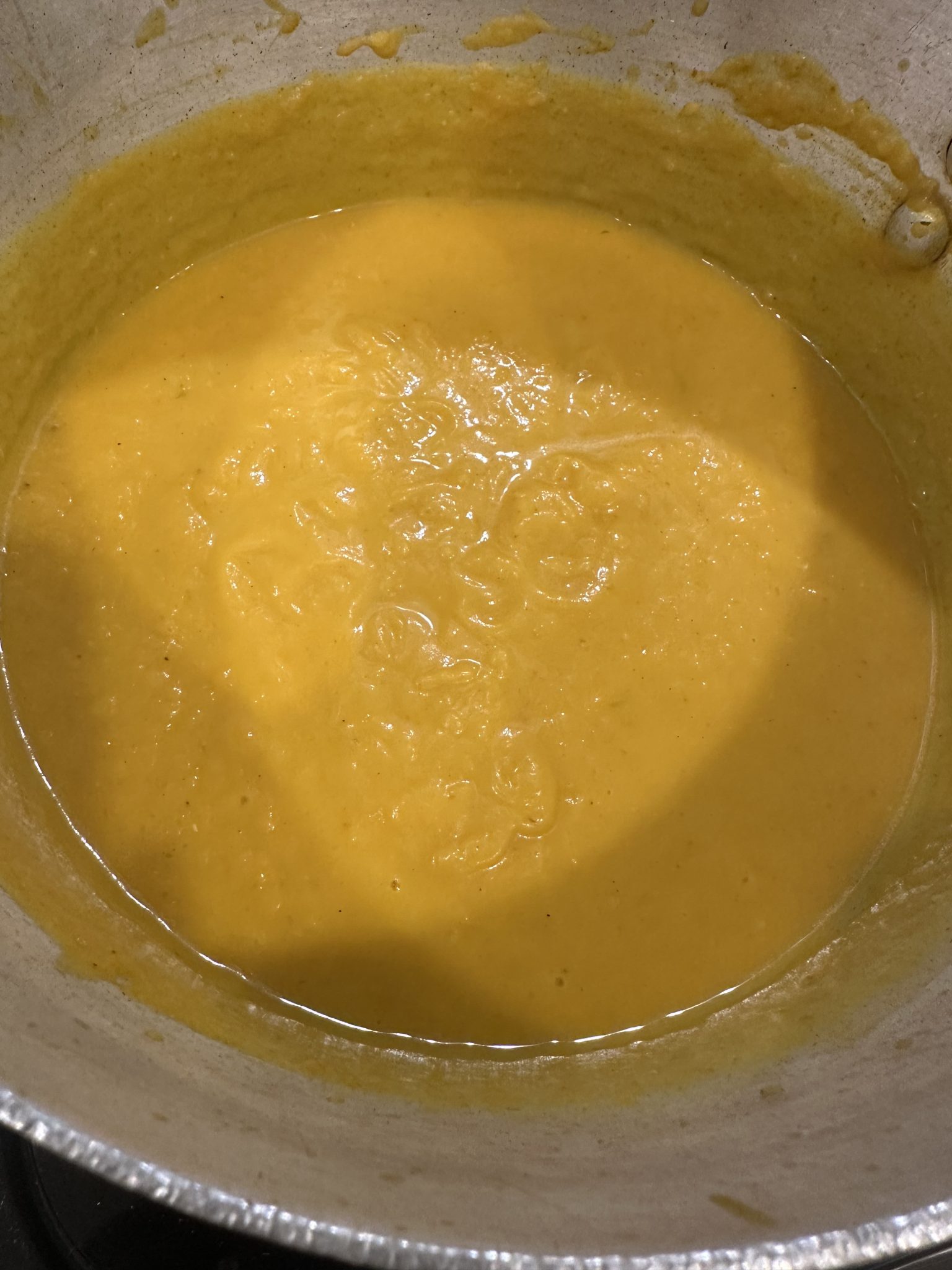 - Add in the roasted squash, broth, spices, apple juice and lemon juice. Bring to a boil.